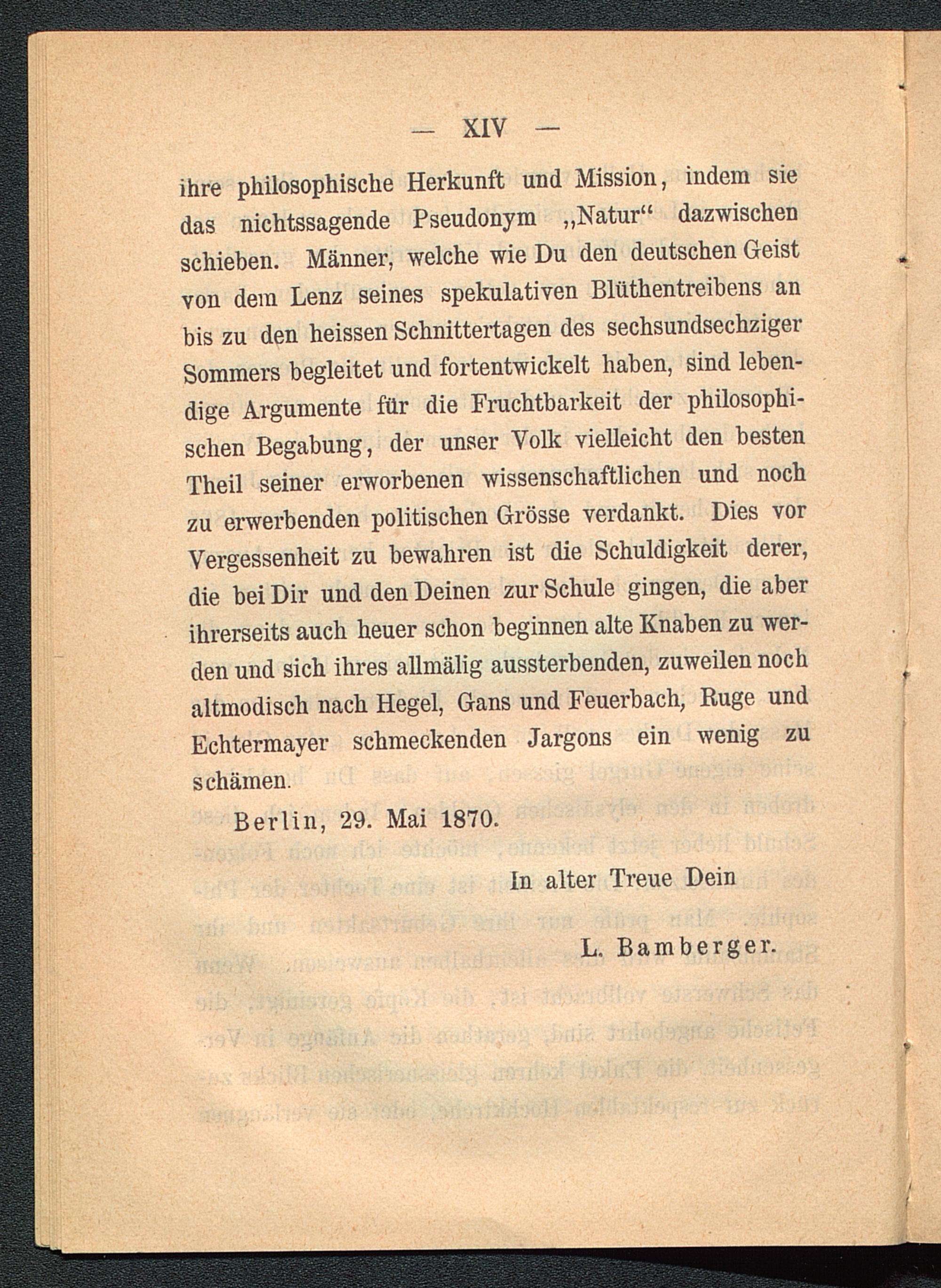 ihre philosophische Herkunft und Mission, indem siedas nichtssagende Pseudonym „Natur“ dazwischenschieben. Männer, welche wie Du den deutschen Geistvon dem Lenz seines spekulativen Blüthentreibens anbis zu den heissen Schnittertagen des sechsundsechzigerSommers begleitet und fortentwickelt haben, sind leben-dige Argumente für die Fruchtbarkeit der philosophi-schen Begabung, der unser Volk vielleicht den bestenTheil seiner erworbenen wissenschaftlichen und nochzu erwerbenden politischen Grösse verdankt. Dies vorVergessenheit zu bewahren ist die Schuldigkeit derer,die bei Dir und den Deinen zur Schule gingen, die aberihrerseits auch heuer schon beginnen alte Knaben zu wer-den und sich ihres allmälig aussterbenden, zuweilen nochaltmodisch nach Hegel , Gans und Feuerbach, Buge undEchtermayer schmeckenden Jargons ein wenig zuschämen.