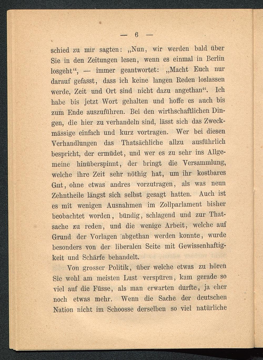schied zu mir sagten: „Nun, wir werden bald überSie in den Zeitungen lesen, wenn es einmal in Berlin losgeht“, — immer geantwortet: „Macht Euch nurdarauf gefasst, dass ich keine langen Beden loslassenwerde, Zeit und Ort sind nicht dazu angethan“. Ichhabe bis jetzt Wort gehalten und hoffe es auch biszum Ende auszuführen. Bei den wirtschaftlichen Din-gen, die hier zu verhandeln sind, lässt sich das Zweck-mässige einfach und kurz vortragen. Wer bei diesenVerhandlungen das Thatsächliche allzu ausführlichbespricht, der ermüdet, und wer es zu sehr ins Allge-meine hinüberspinnt, der bringt die Versammlung,welche ihre Zeit sehr nöthig hat, um ihr kostbaresGut, ohne etwas andres vorzutragen, als was neunZehntheile längst sich selbst gesagt hatten. Auch istes mit wenigen Ausnahmen im Zollparlament bisherbeobachtet worden, bündig, schlagend und zur Tliat-sache zu reden, und die wenige Arbeit, welche aufGrund der Vorlagen 'abgethan werden konnte, wurdebesonders von der liberalen Seite mit Gewissenhaftig-keit und Schärfe behandelt.