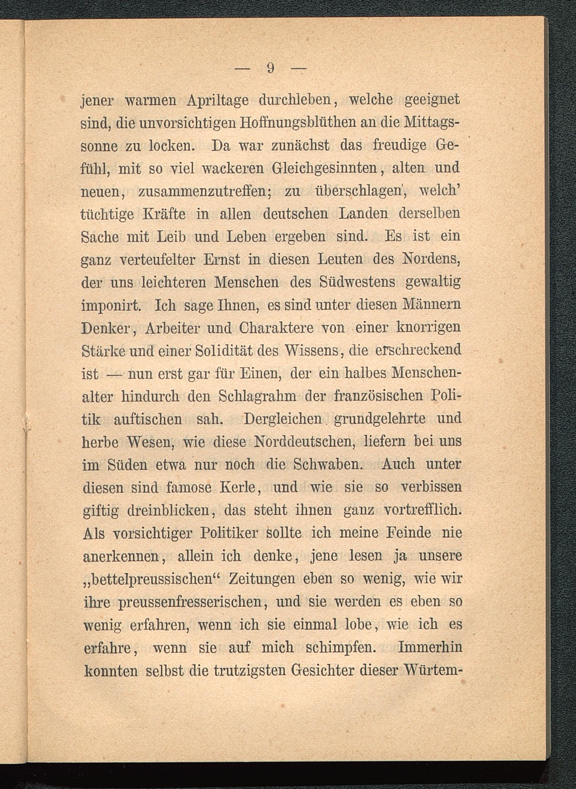 jener warmen Apriltage durchleben, welche geeignetsind, die unvorsichtigen Hoffnungsblüthen an die Mittags-sonne zu locken. Da war zunächst das freudige Ge-fühl, mit so viel wackeren Gleichgesinnten, alten undneuen, zusammenzutreffen; zu überschlagen', welch’tüchtige Kräfte in allen deutschen Landen derselbenSache mit Leib und Leben ergeben sind. Es ist einganz verteufelter Ernst in diesen Leuten des Nordens,der uns leichteren Menschen des Südwestens gewaltigimponirt. Ich sage Ihnen, es sind unter diesen MännernDenker, Arbeiter und Charaktere von einer knorrigenStärke und einer Solidität des Wissens, die erschreckendist — nun erst gar für Einen, der ein halbes Menschen-alter hindurch den Schlagrahm der französischen Poli-tik auftischen sah. Dergleichen, grundgelehrte undherbe Wesen, wie diese Norddeutschen, liefern bei unsim Süden etwa nur noch die Schwaben. Auch unterdiesen sind famose Kerle, und wie sie so verbissengiftig dreinblicken, das steht ihnen ganz vortrefflich.Als vorsichtiger Politiker sollte ich meine Feinde nieanerkennen, allein ich denke, jene lesen ja unsere„bettelpreussischen“ Zeitungen eben so wenig, wie wirihre preussenfresserischen, und sie werden es eben sowenig erfahren, wenn ich sie einmal lobe, wie ich eserfahre, wenn sie auf mich schimpfen. Immerhinkonnten selbst die trutzigsten Gesichter dieser Würtem-