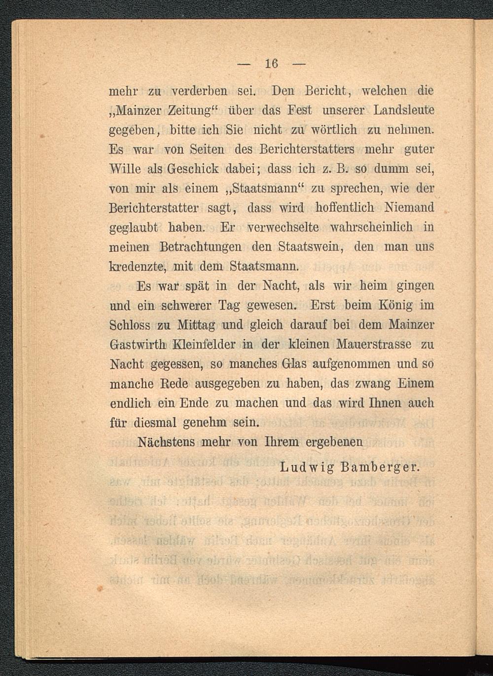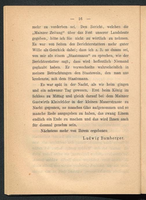 mehr zu verderben sei. Den Bericht, welchen die„Mainzer Zeitung“ über das Fest unserer Landsleutegegeben, bitte ich Sie nicht zu wörtlich zu nehmen.Es war von Seiten des Berichterstatters mehr guterWille als Geschick dabei; dass ich z. B. so dumm sei,von mir als einem „Staatsmann“ zu sprechen, wie derBerichterstatter sagt, dass wird hoffentlich Niemandgeglaubt haben. Er verwechselte wahrscheinlich inmeinen Betrachtungen den Staatswein, den man unskredenzte, mit dem Staatsmann.