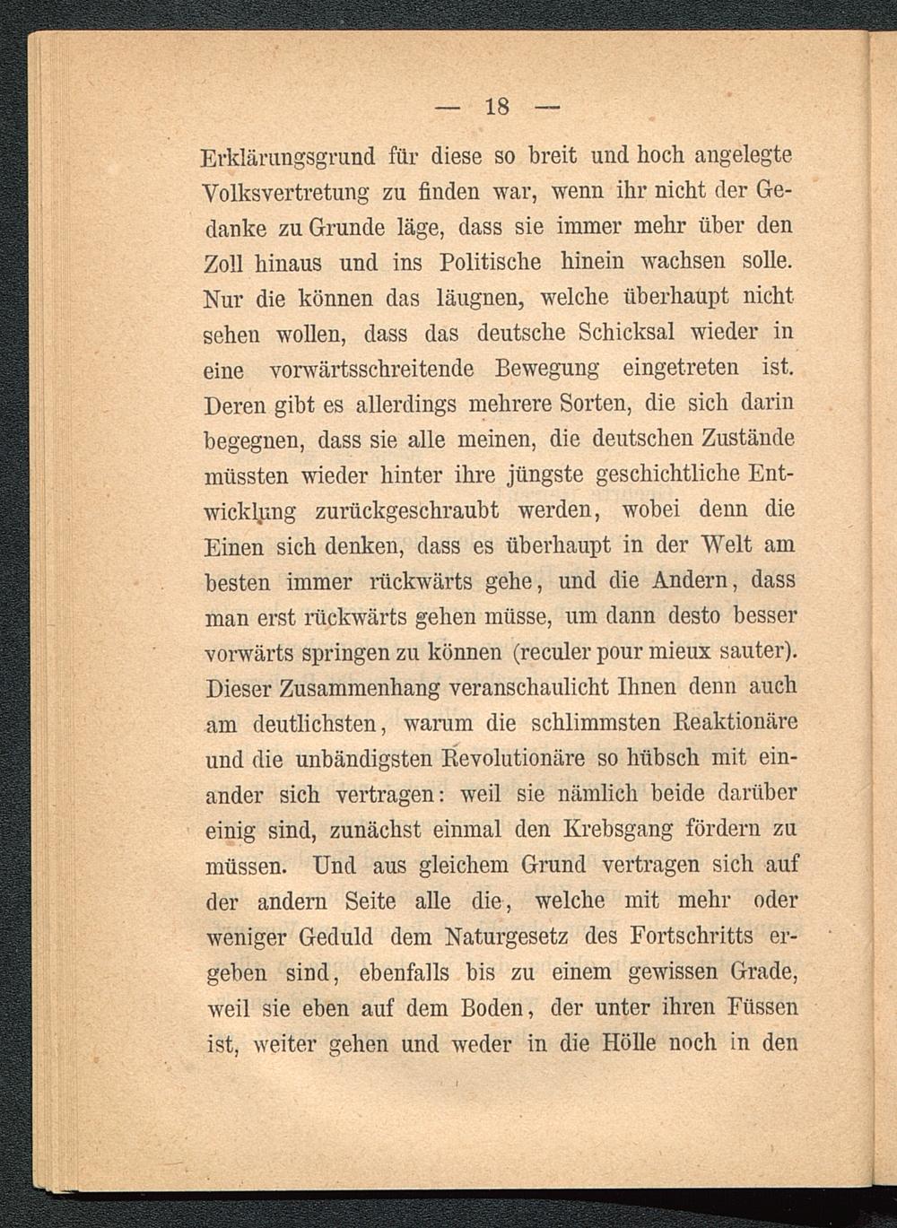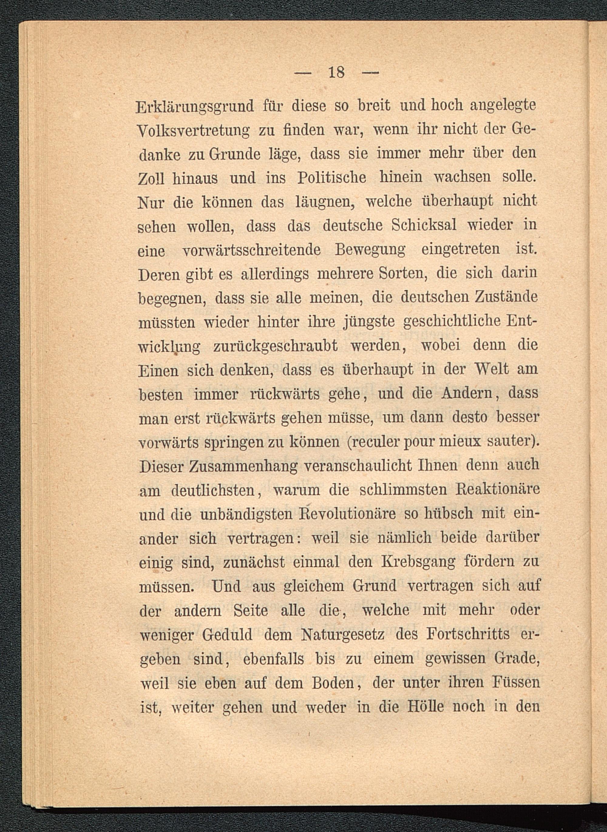 Erklärungsgrund für diese so breit und hoch angelegteVolksvertretung zu finden war, wenn ihr nicht der Ge-danke zu Grunde läge, dass sie immer mehr über denZoll hinaus und ins Politische hinein wachsen solle.Nur die können das läugnen, welche überhaupt nichtsehen wollen, dass das deutsche Schicksal wieder ineine vorwärtsschreitende Bewegung eingetreten ist.Deren gibt es allerdings mehrere Sorten, die sich darinbegegnen, dass sie alle meinen, die deutschen Zuständemüssten wieder hinter ihre jüngste geschichtliche Ent-wicklung zurückgeschraubt werden, wobei denn dieEinen sich denken, dass es überhaupt in der Welt ambesten immer rückwärts gehe, und die Andern, dassman erst rückwärts gehen müsse, um dann desto besservorwärts springen zu können (reculer pour mieux sauter).Dieser Zusammenhang veranschaulicht Ihnen denn aucham deutlichsten, warum die schlimmsten .Reaktionäreund die unbändigsten Revolutionäre so hübsch mit ein-ander sich vertragen: weil sie nämlich beide darübereinig sind, zunächst einmal den Krebsgang fördern zumüssen. Und aus gleichem Grand vertragen sich aufder andern Seite alle die, welche mit mehr oderweniger Geduld dem Naturgesetz des Fortschritts er-geben sind, ebenfalls bis zu einem gewissen Grade,weil sie eben auf dem Boden, der unter ihren Füssen ist, weiter gehen und weder in die Hölle noch in den