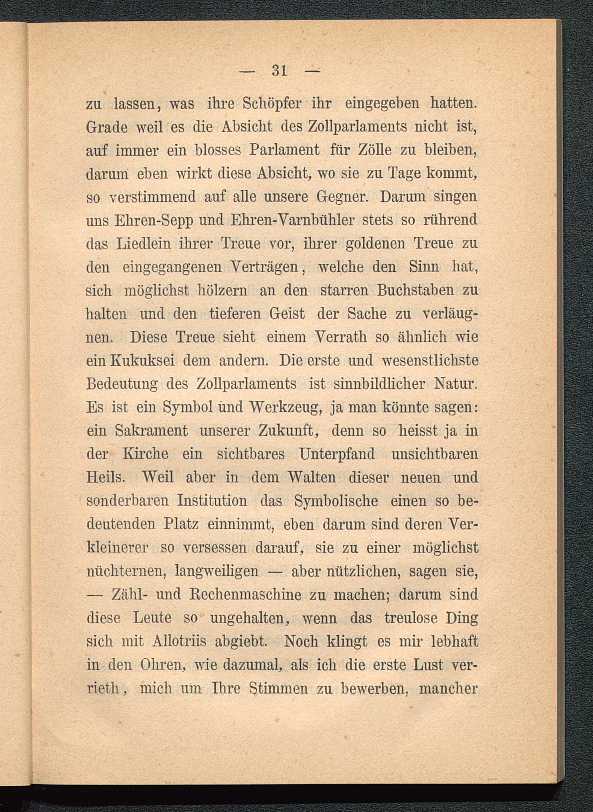zu lassen, was ihre Schöpfer ihr eingegeben hatten.Grade weil es die Absicht des Zollparlaments nicht ist,auf immer ein blosses Parlament für Zölle zu bleiben,darum eben wirkt diese Absicht, wo sie zu Tage kommt,so verstimmend auf alle unsere Gegner. Darum singenuns Ehren-Sepp und Ehren-Varnbühler stets so rührenddas Liedlein ihrer Treue vor, ihrer goldenen Treue zuden eingegangenen Verträgen, welche den Sinn hat,sich möglichst hölzern an den starren Buchstaben zuhalten und den tieferen Geist der Sache zu verläug-nen. Diese Treue sieht einem Verrath so ähnlich wieein Kukuksei dem andern. Die erste und wesenstlicksteBedeutung des Zollparlaments ist sinnbildlicher Natur.Es ist ein Symbol und Werkzeug, ja man könnte sagen:ein Sakrament unserer Zukunft, denn so heisst ja inder Kirche ein sichtbares Unterpfand unsichtbarenHeils. Weil aber in dem Walten dieser neuen undsonderbaren Institution das Symbolische einen so be-deutenden Platz einnimmt, eben darum sind deren Ver-kleinere!' so versessen darauf, sie zu einer möglichstnüchternen, langweiligen — aber nützlichen, sagen sie,— Zähl- und Bechenmaschine zu machen; darum sinddiese Leute so ungehalten, wenn das treulose Dingsich mit Allotriis abgiebt. Noch klingt es mir lebhaftin den Ohren, wie dazumal, als ich die erste Lust ver-rieth, mich um Ihre Stimmen zu bewerben, mancher