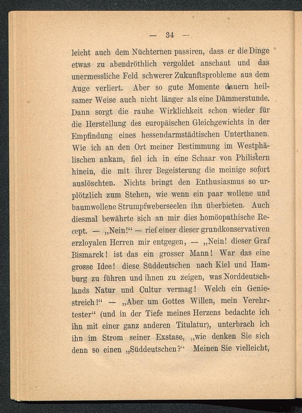 leicht auch dem Nüchternen passiren, dass er die Dingeetwas zu abendröthlich vergoldet anschaut und dasunermessliche Feld schwerer Zukunftsprobleme aus demAuge verliert. Aber so gute Momente dauern heil-samer Weise auch nicht länger als eine Dämmerstunde.Dann sorgt die rauhe Wirklichkeit schon wieder fürdie Herstellung des europäischen Gleichgewichts in derEmpfindung eines hessendarmstädtischen Unterthanen.Wie ich an den Ort meiner Bestimmung im Westphä-lischen ankam, fiel ich in eine Schaar von Philisternhinein, die mit ihrer Begeisterung die meinige sofortauslöschten. Nichts bringt den Enthusiasmus so ur-plötzlich zum Stehen, wie wenn ein paar wollene undbaumwollene Strumpfweberseelen ihn überbieten. Auchdiesmal bewährte sich an mir dies homöopathische Re-cept. — „Nein!“ — rief einer dieser grundkonservativenerzloyalen Herren mir entgegen, — „Nein! dieser GrafBismarck! ist das ein grosser Mann! War das einegrosse Idee! diese Süddeutschen nach Kiel und Ham-burg zu führen und ihnen zu zeigen, was Norddeutsch-lands Natur und Cultur vermag! Welch ein Genie-streich!“ — „Aber um Gottes Willen, mein Verehr-tester“ (und in der Tiefe meines Herzens bedachte ichihn mit einer ganz anderen Titulatur), unterbrach ichihn im Strom seiner Exstase, „wie denken Sie sichdenn so einen „Süddeutschen?“ Meinen Sie vielleicht,