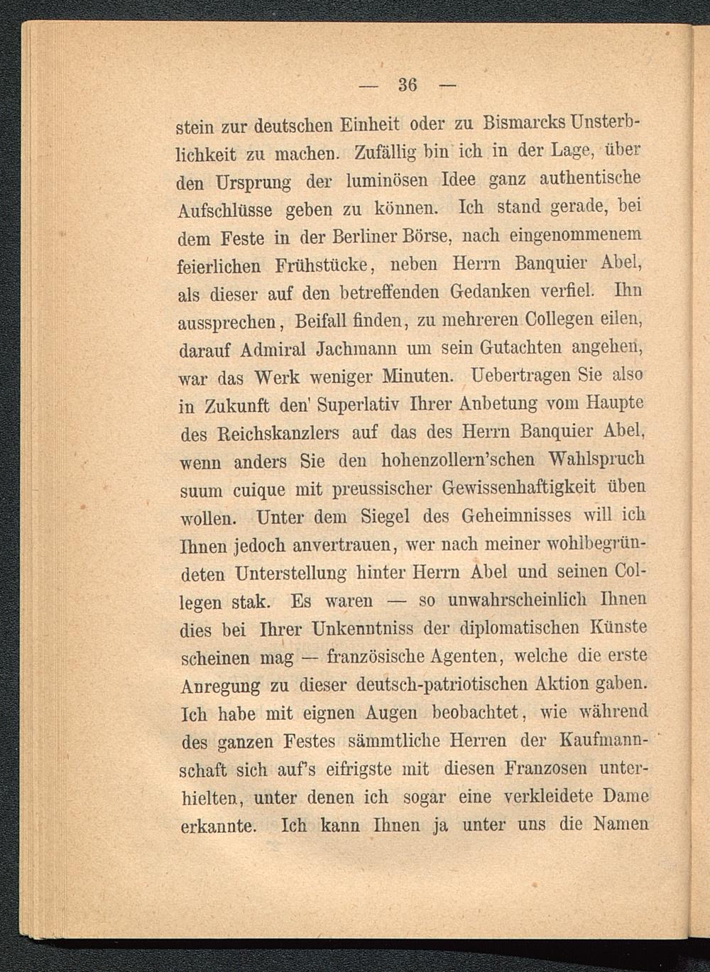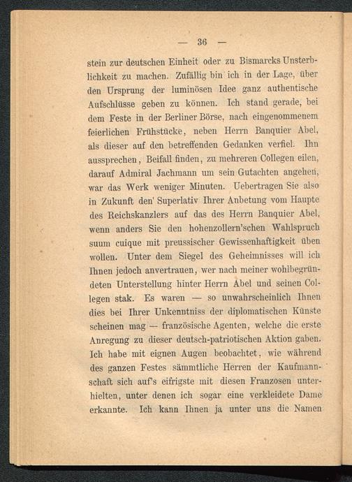 stein zur deutschen Einheit oder zu Bismarcks Unsterb-lichkeit zu machen. Zufällig bin ich in der Lage, überden Ursprung der luminösen Idee ganz authentischeAufschlüsse geben zu können. Ich stand gerade, beidem Feste in der Berliner Börse , nach eingenommenemfeierlichen Frühstücke, neben Herrn Banquier Abel,als dieser auf den betreffenden Gedanken verfiel. Ihnaussprechen, Beifall finden, zu mehreren Collegen eilen,darauf Admiral Jachmann um sein Gutachten angehen,war das Werk weniger Minuten. Uebertragen Sie alsoin Zukunft den' Superlativ Ihrer Anbetung vom Hauptedes Reichskanzlers auf das des Herrn Banquier Abel,wenn anders Sie den holienzollern’schen Wahlspruchsuum cuique mit preussisclier Gewissenhaftigkeit übenwollen. Unter dem Siegel des Geheimnisses will ichIhnen jedoch anvertrauen, wer nach meiner wohlbegrün-deten Unterstellung hinter Herrn Abel und seinen Col-legen stak. Es waren — so unwahrscheinlich Ihnendies bei Ihrer Unkenntniss der diplomatischen Künstescheinen mag — französische Agenten, welche die ersteAnregung zu dieser deutsch -patriotischen Aktion gaben.Ich habe mit eignen Augen beobachtet, wie währenddes ganzen Festes sämmtliclie Herren der Kaufmann-schaft sich aufs eifrigste mit diesen Franzosen unter-hielten, unter denen ich sogar eine verkleidete Dameerkannte. Ich kann Ihnen ja unter uns die Namen