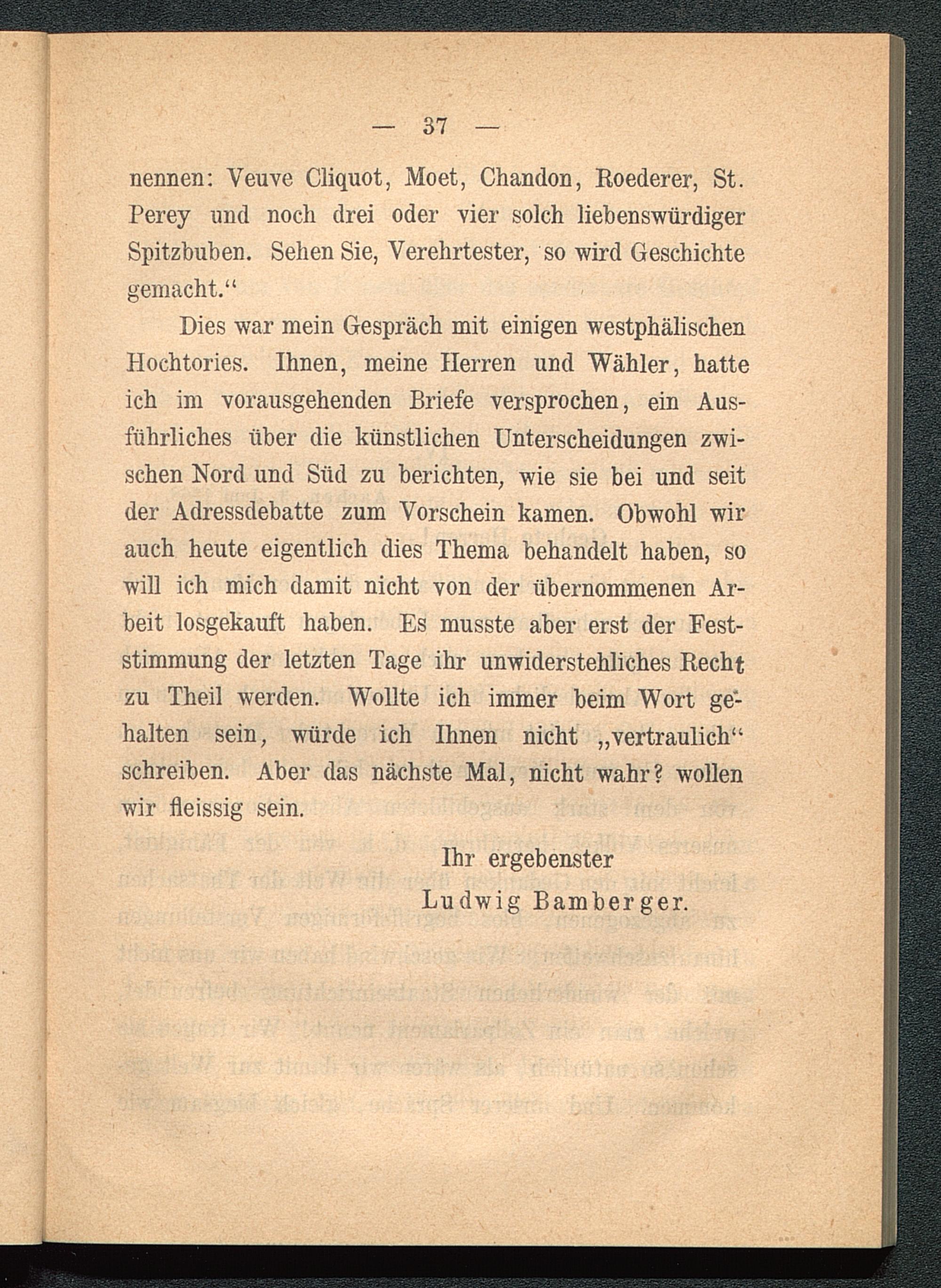 Dies war mein Gespräch mit einigen westphälischenHochtories. Ihnen, meine Herren und Wähler, hatteich im vorausgehenden Briefe versprochen, ein Aus-führliches über die künstlichen Unterscheidungen zwi-schen Nord und Süd zu berichten, wie sie bei und seitder Adressdebatte zum Vorschein kamen. Obwohl wirauch heute eigentlich dies Thema behandelt haben, sowill ich mich damit nicht von der übernommenen Ar-beit losgekauft haben. Es musste aber erst der Fest-stimmung der letzten Tage ihr unwiderstehliches Rechtzu Theil werden. Wollte ich immer beim Wort ge'-halten sein, würde ich Ihnen nicht „vertraulich“schreiben. Aber das nächste Mal, nicht wahr? wollenwir fleissig sein.