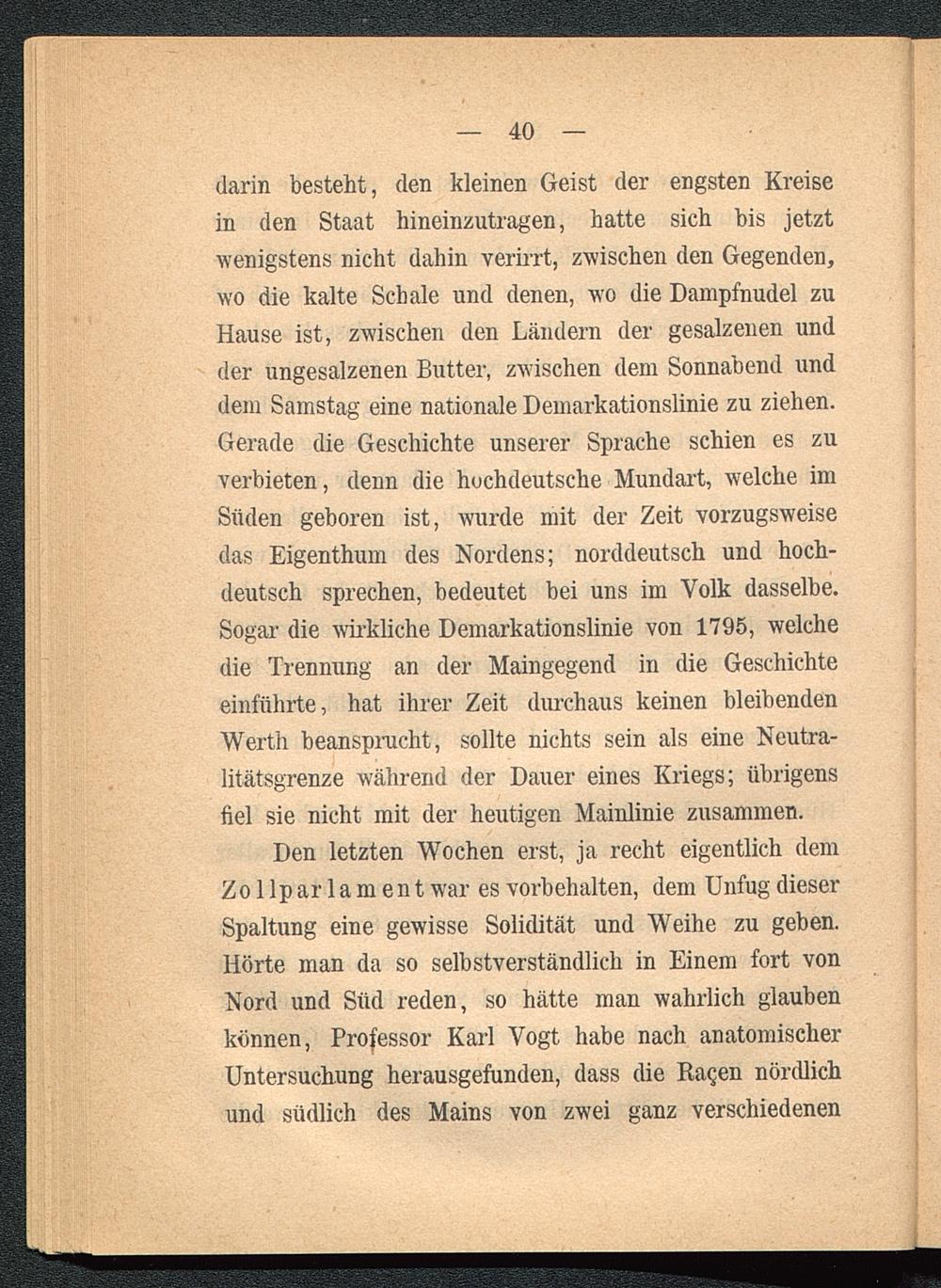 Den letzten Wochen erst, ja recht eigentlich demZollparlament war es Vorbehalten, dem Unfug dieserSpaltung eine gewisse Solidität und Weihe zu geben.Hörte man da so selbstverständlich in Einem fort vonNord und Süd reden, so hätte man wahrlich glaubenkönnen, Professor Karl Vogt habe nach anatomischerUntersuchung herausgefunden, dass die Ragen nördlichund südlich des Mains von zwei ganz verschiedenen