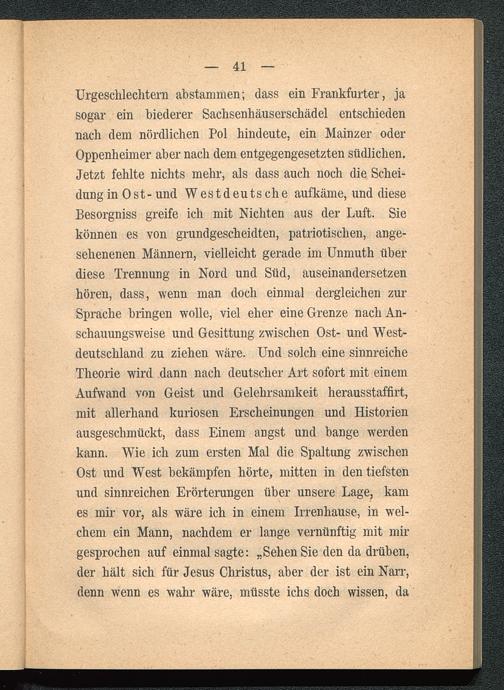 Urgeschlechtern abstammen; dass ein Frankfurter, jasogar ein biederer Sacbsenhäuserscbädel entschiedennach dem nördlichen Pol hindeute, ein Mainzer oderOppenheimer aber nach dem entgegengesetzten südlichen.Jetzt fehlte nichts mehr, als dass auch noch die Schei-dung in Ost-und Westdeutsche aufkäme, und dieseBesorgniss greife ich mit Nichten aus der Luft. Siekönnen es von grundgescheidten, patriotischen, ange-sehenenen Männern, vielleicht gerade im Unmuth überdiese Trennung in Nord und Süd, auseinandersetzenhören, dass, wenn man doch einmal dergleichen zurSprache bringen wolle, viel eher eine Grenze nach An-schauungsweise und Gesittung zwischen Ost- und West-deutschland zu ziehen wäre. Und solch eine sinnreicheTheorie wird dann nach deutscher Art sofort mit einemAufwand von Geist und Gelehrsamkeit lierausstaffirt,mit allerhand kuriosen Erscheinungen und Historienausgeschmückt, dass Einem angst und bange werdenkann. Wie ich zum ersten Mal die Spaltung zwischenOst und West bekämpfen hörte, mitten in den tiefstenund sinnreichen Erörterungen über unsere Lage, kames mir vor, als wäre ich in einem Irrenhause, in wel-chem ein Mann, nachdem er lange vernünftig mit mirgesprochen auf einmal sagte: „Sehen Sie den da drüben,der hält sich für Jesus Christus, aber der ist ein Narr,denn wenn es wahr wäre, müsste ichs doch wissen, da