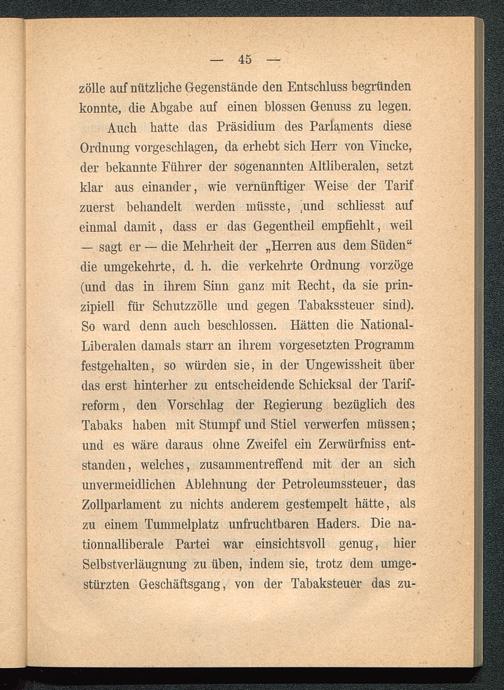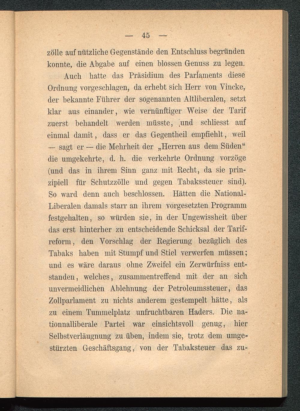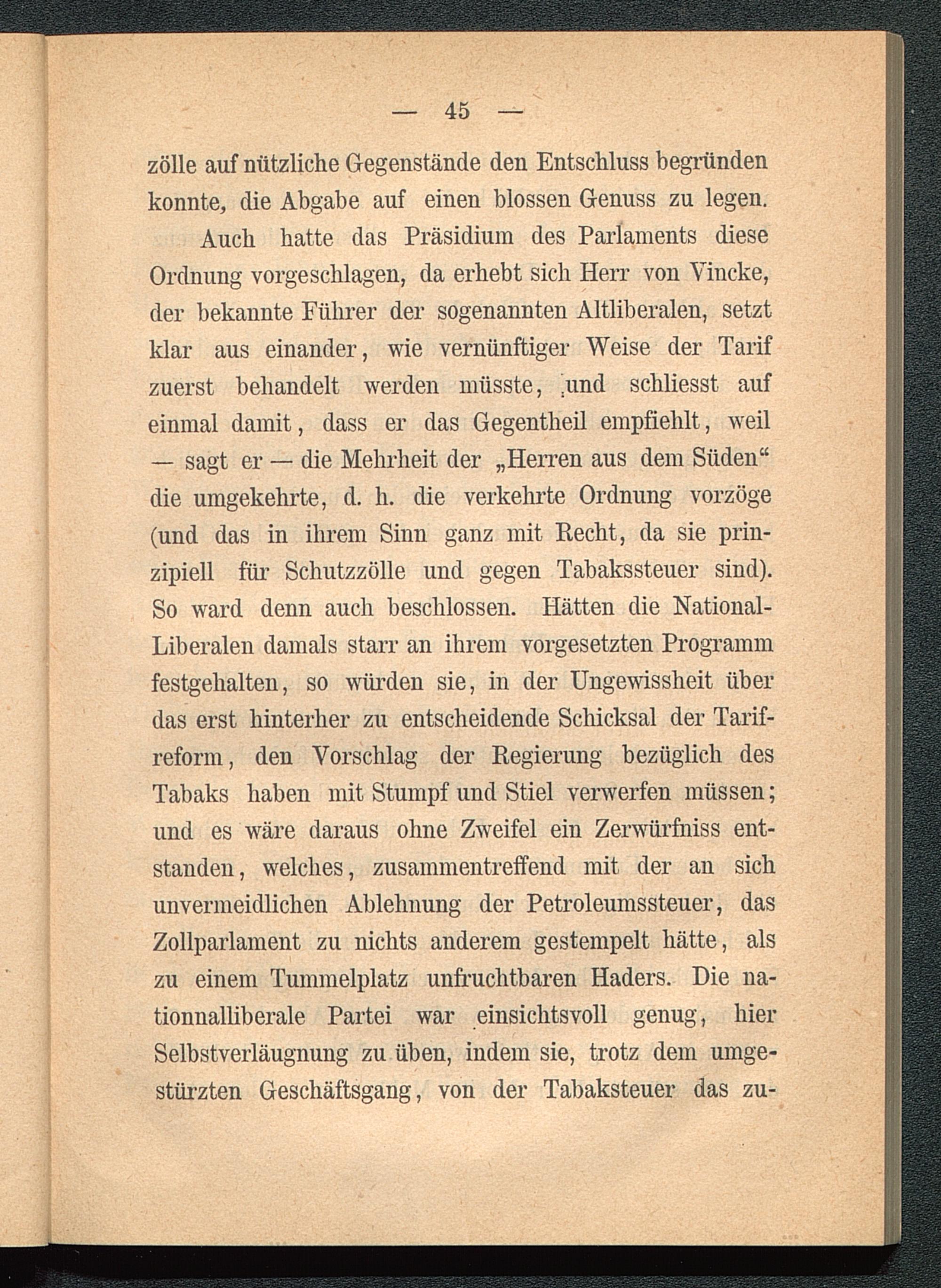 Auch hatte das Präsidium des Parlaments dieseOrdnung vorgeschlagen, da erhebt sich Herr von Vincke,der bekannte Führer der sogenannten Altliberalen, setztklar aus einander, wie vernünftiger Weise der Tarifzuerst behandelt werden müsste, 'und scliliesst aufeinmal damit, dass er das Gegentlieil empfiehlt, weil— sagt er — die Mehrheit der „Herren aus dem Süden“die umgekehrte, d. h. die verkehrte Ordnung vorzöge(und das in ihrem Sinn ganz mit Recht, da sie prin-zipiell für Schutzzölle und gegen Tabakssteuer sind).So ward denn auch beschlossen. Hätten die National-Liberalen damals starr an ihrem Vorgesetzten Programmfestgehalten, so würden sie, in der Ungewissheit überdas erst hinterher zu entscheidende Schicksal der Tarif-reform, den Vorschlag der Regierung bezüglich desTabaks haben mit Stumpf und Stiel verwerfen müssen;und es wäre daraus ohne Zweifel ein Zerwürfniss ent-standen, welches, zusammentreffend mit der an sichunvermeidlichen Ablehnung der Petroleumssteuer, dasZollparlament zu nichts anderem gestempelt hätte, alszu einem Tummelplatz unfruchtbaren Haders. Die na-tionnalliberale Partei war einsichtsvoll genug, hierSelbstverläugnung zu üben, indem sie, trotz dem umge-stürzten Geschäftsgang, von der Tabaksteuer das zu-