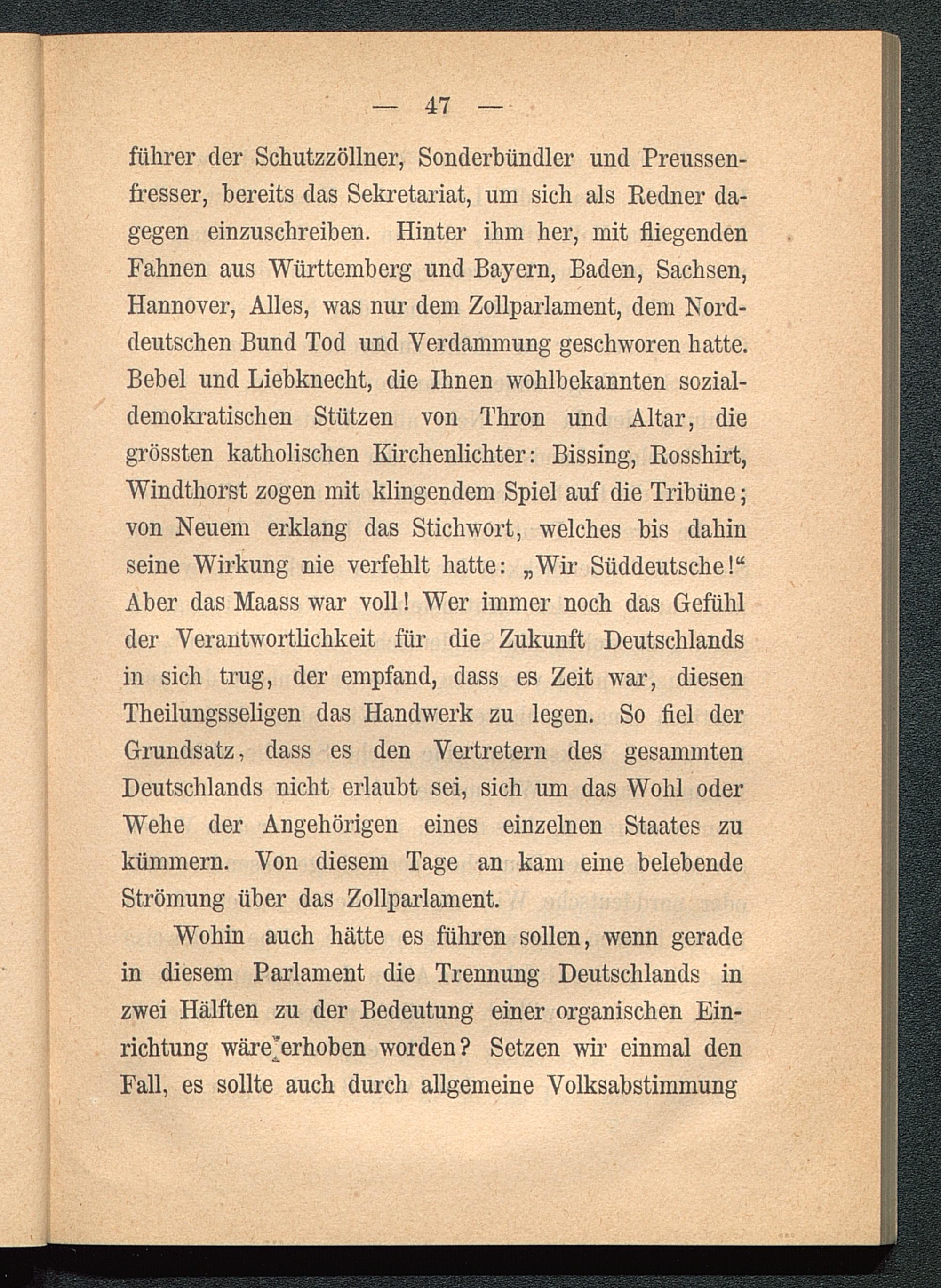 fülirer der Schutzzöllner, Sonderbündler und Preussen-fresser, bereits das Sekretariat, um sich als Redner da-gegen einzuscbreiben. Hinter ihm her, mit fliegendenFahnen aus Württemberg und Bayern , Baden, Sachsen,Hannover , Alles, was nur dem Zollparlament, dem Nord-deutschen Bund Tod und Verdammung geschworen hatte.Bebel und Liebknecht, die Ihnen wohlbekannten sozial-demokratischen Stützen von Thron und Altar, diegrössten katholischen Kirchenlichter: Bissing, Rosshirt,Windthorst zogen mit klingendem Spiel auf die Tribüne;von Neuem erklang das Stichwort, welches bis dahinseine Wirkung nie verfehlt hatte: „Wir Süddeutsche!“Aber das Maass war voll! Wer immer noch das Gefühlder Verantwortlichkeit für die Zukunft Deutschlands in sich trug, der empfand, dass es Zeit war, diesenTheilungsseligen das Handwerk zu legen. So fiel derGrundsatz, dass es den Vertretern des gesammtenDeutschlands nicht erlaubt sei, sich um das Wohl oderWehe der Angehörigen eines einzelnen Staates zukümmern. Von diesem Tage an kam eine belebendeStrömung über das Zollparlament.
