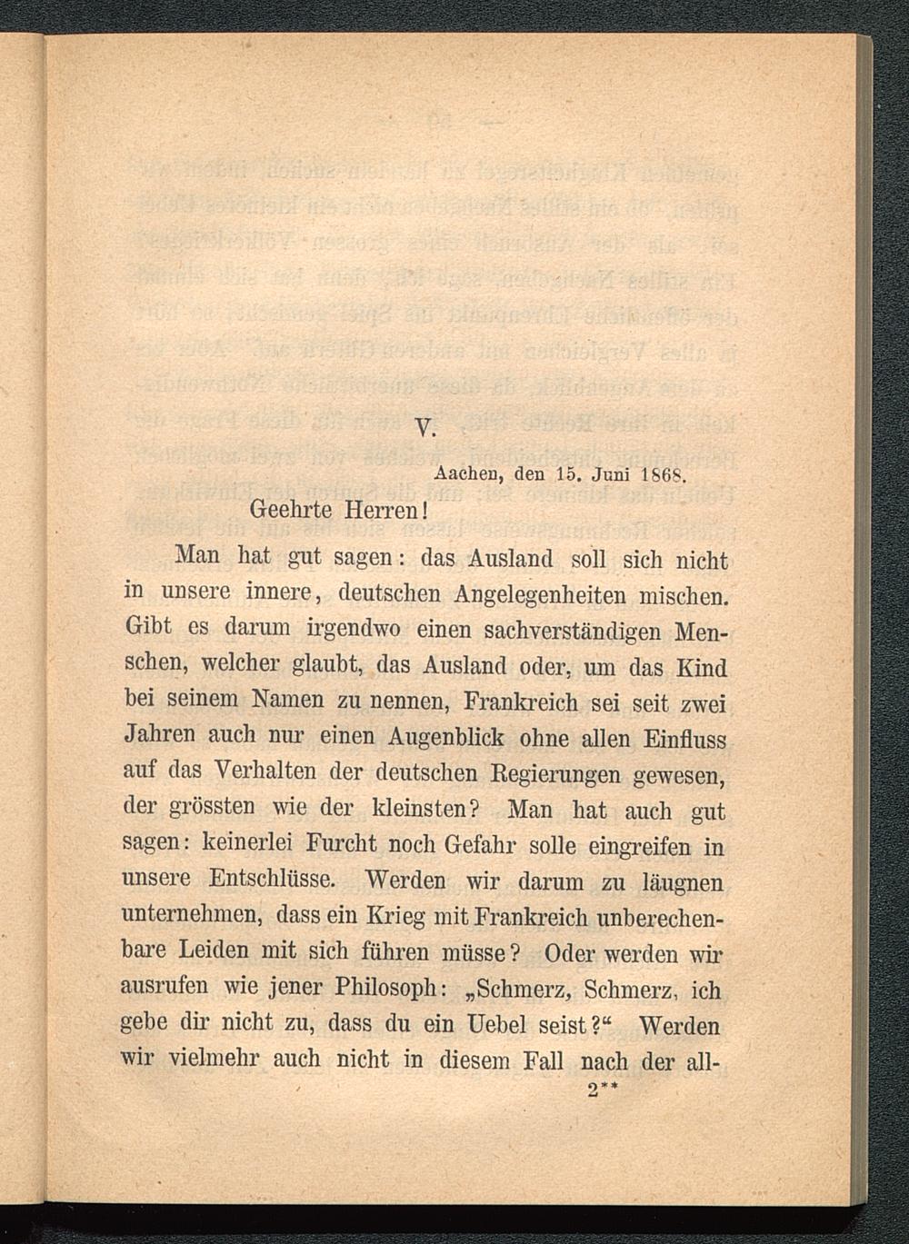 Man hat gut sagen: das Ausland soll sich nichtin unsere innere, deutschen Angelegenheiten mischen.Gibt es darum irgendwo einen sachverständigen Men-schen, welcher glaubt, das Ausland oder, um das Kindbei seinem Namen zu nennen, Frankreich sei seit zweiJahren auch nur einen Augenblick ohne allen Einflussauf das Verhalten der deutschen Regierungen gewesen,der grössten wie der kleinsten? Man hat auch gutsagen: keinerlei Furcht noch Gefahr solle eingreifen inunsere Entschlüsse. Werden wir darum zu läugnenunternehmen, dass ein Krieg mit Frankreich unberechen-bare Leiden mit sich führen müsse ? Oder werden wirausrufen wie jener Philosoph: „Schmerz, Schmerz, ichgebe dir nicht zu, dass du ein Uebel seist?“ Werdenwir vielmehr auch nicht in diesem Fall nach der all-