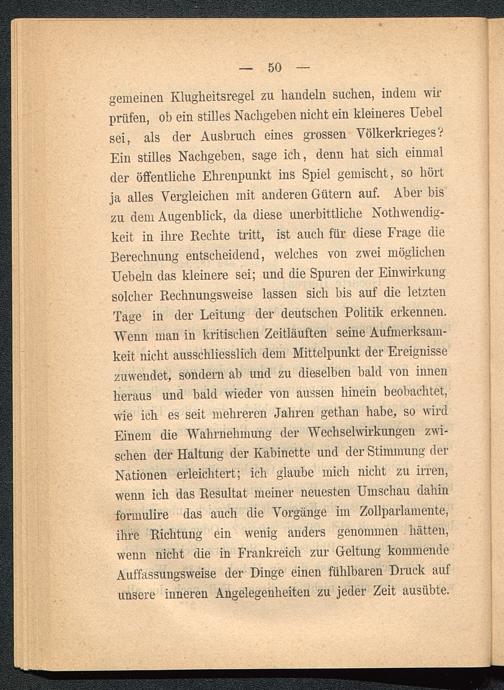 gemeinen Klugheitsregel zu handeln suchen, indem wirprüfen, ob ein stilles Nachgeben nicht ein kleineres Uebelsei, als der Ausbruch eines grossen VölkerkriegesVEin stilles Nachgeben, sage ich, denn hat sich einmalder öffentliche Ehrenpunkt ins Spiel gemischt, so hörtja alles Vergleichen mit anderen Gütern auf. Aber biszu dem Augenblick, da diese unerbittliche Nothwendig-keit in ihre Rechte tritt, ist auch für diese Frage dieBerechnung entscheidend, welches von zwei möglichenUebeln das kleinere sei; und die Spuren der Einwirkungsolcher Rechnungsweise lassen sich bis auf die letztenTage in der Leitung der deutschen Politik erkennen.Wenn man in kritischen Zeitläuften seine Aufmerksam-keit nicht ausschliesslich dem Mittelpunkt der Ereignissezuwendet, sondern ab und zu dieselben bald von innenheraus und bald wieder von aussen hinein beobachtet,wie ich es seit mehreren Jahren gethan habe, so wirdEinem die Wahrnehmung der Wechselwirkungen zwi-schen der Haltung der Kabinette und der Stimmung derNationen erleichtert; ich glaube mich nicht zu irren,wenn ich das Resultat meiner neuesten Umschau dahinformulire das auch die Vorgänge im Zollparlamente,ihre Richtung ein wenig anders genommen hätten,wenn nicht die in Frankreich zur Geltung kommendeAuffassungsweise der Dinge einen fühlbaren Druck aufunsere inneren Angelegenheiten zu jeder Zeit ausübte.