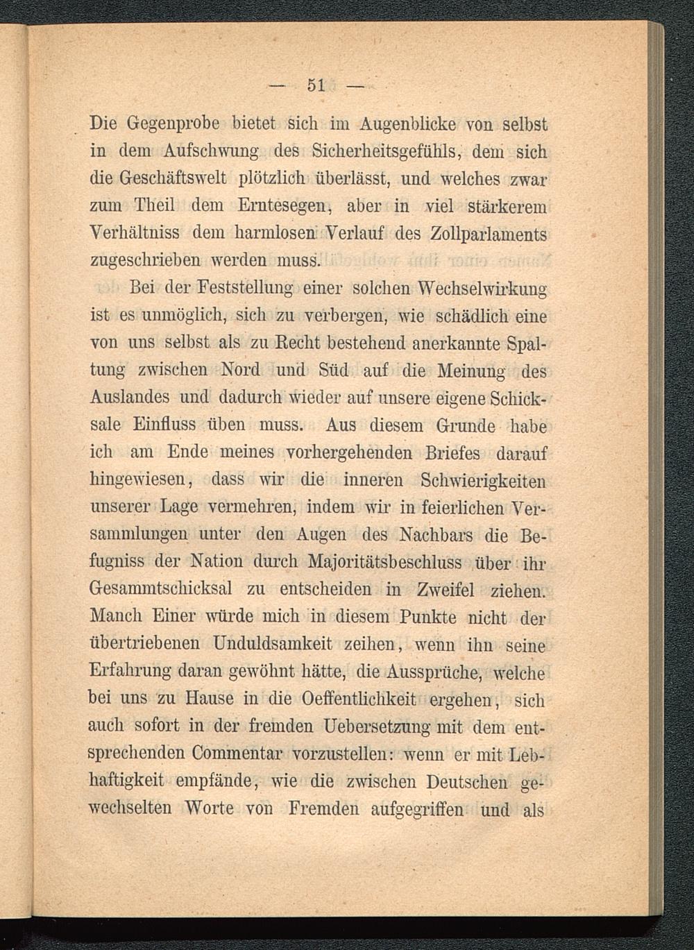 Bei der Feststellung einer solchen Wechselwirkungist es unmöglich, sich zu verbergen, wie schädlich einevon uns selbst als zu Recht bestehend anerkannte Spal-tung zwischen Nord und Süd auf die Meinung desAuslandes und dadurch wieder auf unsere eigene Schick-sale Einfluss üben muss. Aus diesem Grande habeich am Ende meines vorhergehenden Briefes daraufhingewiesen, dass wir die inneren Schwierigkeitenunserer Lage vermehren, indem wir in feierlichen Ver-sammlungen unter den Augen des Nachbars die Be-fugniss der Nation durch Majoritätsbeschluss über ihrGesammtschicksal zu entscheiden in Zweifel ziehen.Manch Einer würde mich in diesem Punkte nicht derübertriebenen Unduldsamkeit zeihen, wenn ihn seineErfahrung daran gewöhnt hätte, die Aussprüche, welchebei uns zu Hause in die Oeffentlichkeit ergehen, sichauch sofort in der fremden Uebersetzung mit dem ent-sprechenden Commentar vorzustellen: wenn er mit Leb-haftigkeit empfände, wie die zwischen Deutschen ge-wechselten Worte von Fremden aufgegriffen und als