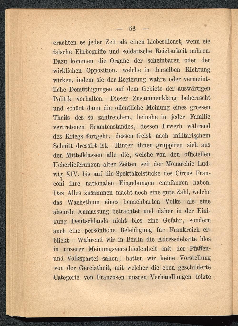 erachten es jeder Zeit als einen Liebesdienst, wenn siefalsche Ehrbegriffe und soldatische Reizbarkeit nähren.Dazu kommen die Organe der scheinbaren oder derwirklichen Opposition, welche in derselben Richtungwirken, indem sie der Regierung wahre oder vermeint-liche Demüthigungen auf dem Gebiete der auswärtigenPolitik Vorhalten. Dieser Zusammenklang beherrschtund schürt dann die öffentliche Meinung eines grossenTheils des so zahlreichen, beinahe in jeder Familievertretenen Beamtenstandes, dessen Erwerb währenddes Kriegs fortgeht, dessen Geist nach militärischemSchnitt dressirt ist. Hinter ihnen gruppiren sieh ausden Mittelklassen alle die, welche von den officiellenUeberlieferungen alter Zeiten seit der Monarchie Lud-wig XIV. bis auf die Spektakelstücke des Circus Fran-coni ihre nationalen Eingebungen empfangen haben.Das Alles zusammen macht noch eine gute Zahl, welchedas Wachsthum eines benachbarten Volks als eineabsurde Anmassung betrachtet und daher in der Eini-gung Deutschlands nicht blos eine Gefahr, sondernauch eine persönliche Beleidigung für Frankreich er-blickt. Während wir in Berlin die Adressdebatte blosin unserer Meinungsverschiedenheit mit der Pfaffen-und Volkspartei sahen, hatten wir keine Vorstellungvon der Gereiztheit, mit welcher die eben geschilderteCategorie von Franzosen unsren Verhandlungen folgte