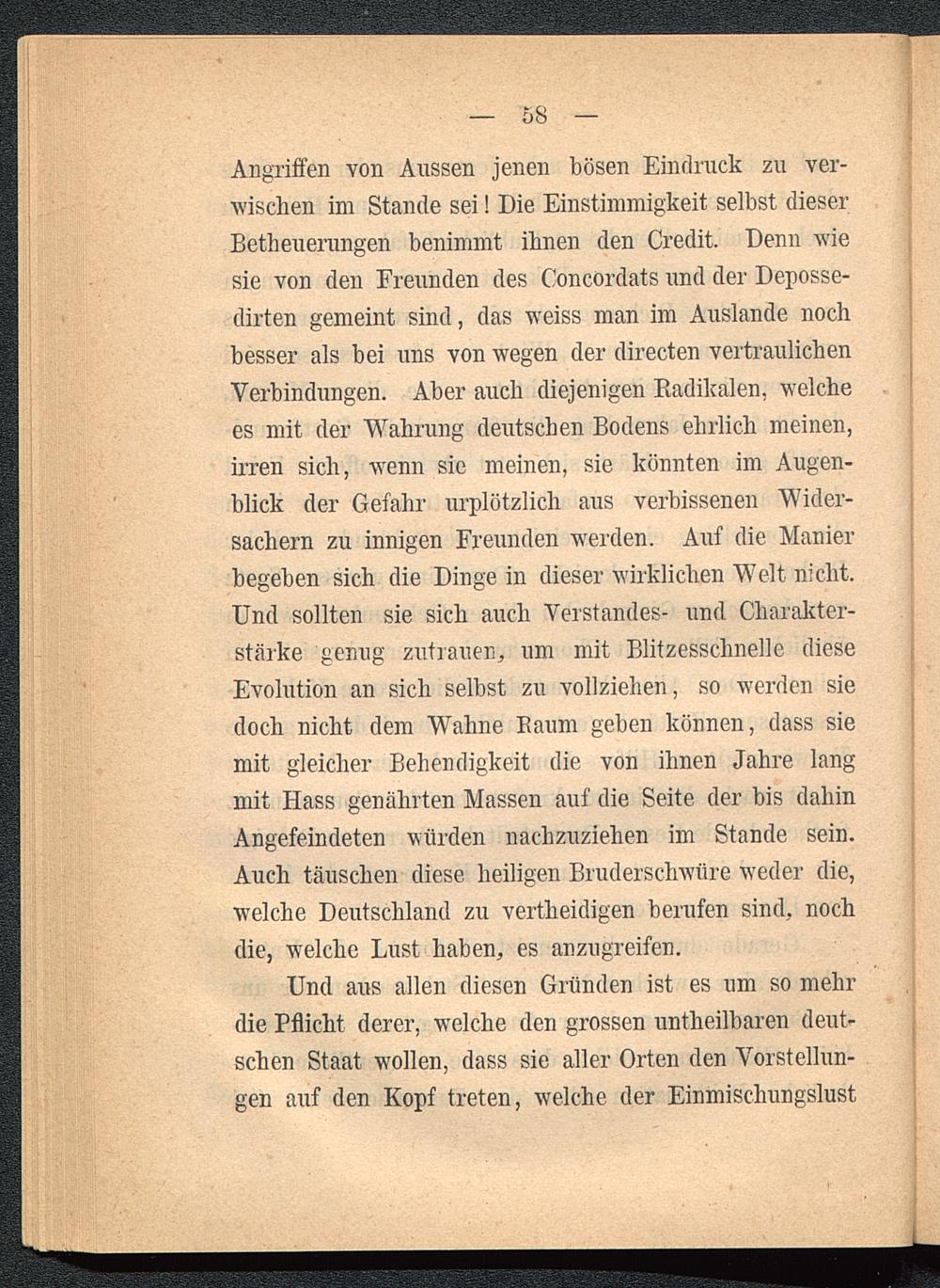 Angriffen von Aussen jenen bösen Eindruck zu ver-wischen im Stande sei! Die Einstimmigkeit selbst dieserBetheuerungen benimmt ihnen den Credit. Denn wiesie von den Freunden des Concördats und der Deposse-dirten gemeint sind, das weiss man im Auslande nochbesser als bei uns von wegen der directen vertraulichenVerbindungen. Aber auch diejenigen Radikalen, welchees mit der Wahrung deutschen Bodens ehrlich meinen,irren sich, wenn sie meinen, sie könnten im Augen-blick der Gefahr urplötzlich aus verbissenen Wider-sachern zu innigen Freunden werden. Auf die Manierbegeben sich die Dinge in dieser wirklichen Welt nicht.Und sollten sie sich auch Verstandes- und Charakter-stärke genug Zutrauen, um mit Blitzesschnelle dieseEvolution an sich selbst zu vollziehen, so werden siedoch nicht dem Wahne Raum geben können, dass siemit gleicher Behendigkeit die von ihnen Jahre langmit Hass genährten Massen auf die Seite der bis dahinAngefeindeten würden nachzuziehen im Stande sein.Auch täuschen diese heiligen Bruderschwüre weder die,welche Deutschland zu vertheidigen berufen sind, nochdie, welche Lust haben, es anzugreifen.