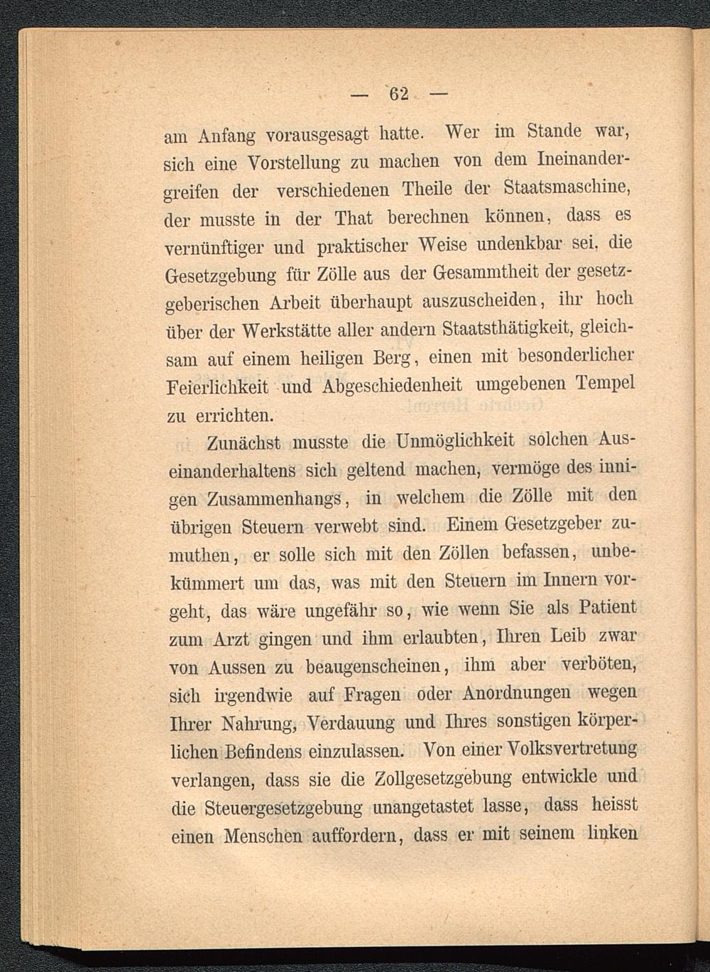 Zunächst musste die Unmöglichkeit solchen Aus-einanderhaltens sich geltend machen, vermöge des inni-gen Zusammenhangs, in welchem die Zölle mit denübrigen Steuern verwebt sind. Einem Gesetzgeber zu-muthen, er solle sich mit den Zöllen befassen, unbe-kümmert um das, was mit den Steuern im Innern vor-geht, das wäre ungefähr so, wie wenn Sie als Patientzum Arzt gingen und ihm erlaubten, Ihren Leib zwarvon Aussen zu beaugenscheinen, ihm aber verböten,sich irgendwie auf Fragen oder Anordnungen wegenIhrer Nahrung, Verdauung und Ihres sonstigen körper-lichen Befindens einzulassen. Von einer Volksvertretungverlangen, dass sie die Zollgesetzgebung entwickle unddie Steuergesetzgebung unangetastet lasse, dass heissteinen Menschen auffordern, dass er mit seinem linken