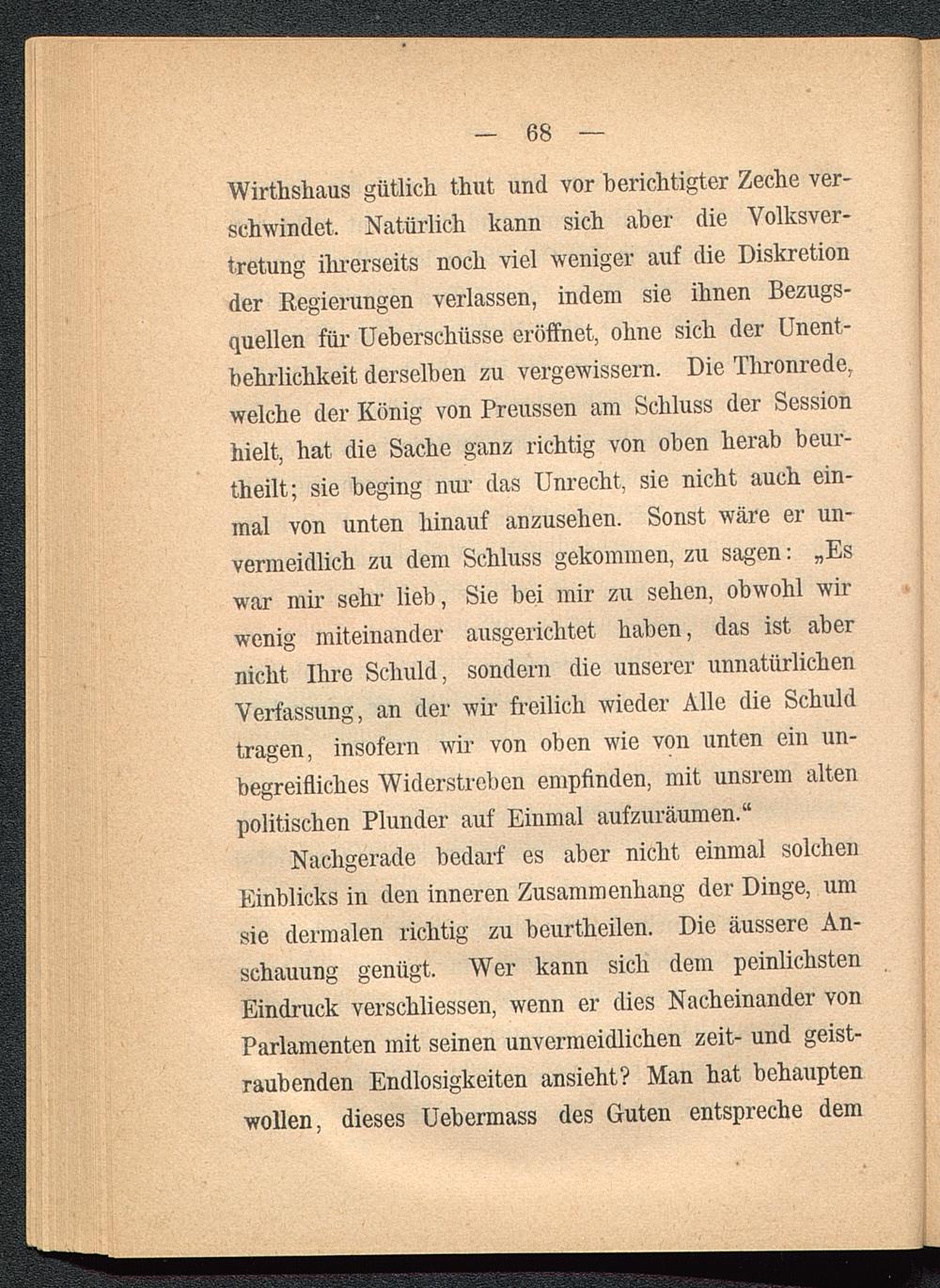 Wirthshaus gütlich thut und vor berichtigter Zeche ver-schwindet, Natürlich kann sich aber die Volksver-tretung ihrerseits noch viel weniger auf die Diskretionder Regierungen verlassen, indem sie ihnen Bezugs-quellen für Ueberschüsse eröffnet, ohne sich der Unent-behrlichkeit derselben zu vergewissern. Die Thronrede,welche der König von Preussen am Schluss der Sessionhielt, hat die Sache ganz richtig von oben herab beur-theilt; sie beging nur das Unrecht, sie nicht auch ein-mal von unten hinauf anzusehen. Sonst wäre er un-vermeidlich zu dem Schluss gekommen, zu sagen: „Eswar mir sehr lieb, Sie bei mir zu sehen, obwohl wirwenig miteinander ausgerichtet haben, das ist abernicht Ihre Schuld, sondern die unserer unnatürlichenVerfassung, an der wir freilich wieder Alle die Schuldtragen, insofern wir von oben wie von unten ein un-begreifliches Widerstreben empfinden, mit unsrem altenpolitischen Plunder auf Einmal aufzuräumen.“