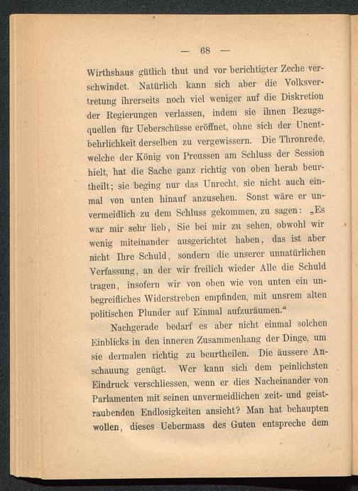 Nachgerade bedarf es aber nicht einmal solchenEinblicks in den inneren Zusammenhang der Dinge, umsie dermalen richtig zu beurtheilen. Die äussere An-schauung genügt. Wer kann sich dem peinlichstenEindruck verschliessen, wenn er dies Nacheinander vonParlamenten mit seinen unvermeidlichen zeit- und geist-raubenden Endlosigkeiten ansieht? Man hat behauptenwollen, dieses Uebermass des Guten entspreche dem
