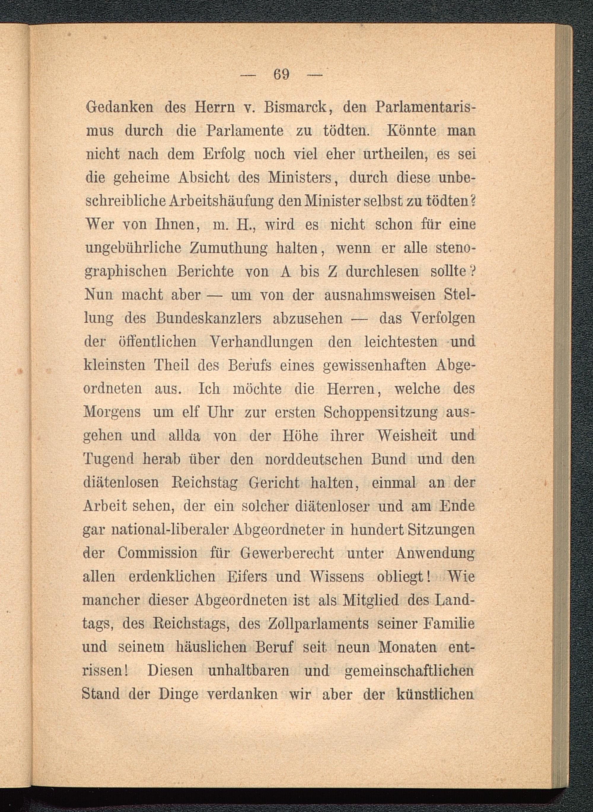Gedanken des Herrn v. Bismarck, den Parlamentaris-mus durch die Parlamente zu tödten. Könnte mannicht nach dem Erfolg noch viel eher urtheilen, es seidie geheime Absicht des Ministers, durch diese unbe-schreibliche Arbeitshäufung den Minister selbst zu tödten?Wer von Ihnen, m. H., wird es nicht schon für eineungebührliche Zumuthung halten, wenn er alle steno-graphischen Berichte von A bis Z durchlesen sollte?Nun macht aber — um von der ausnahmsweisen Stel-lung des Bundeskanzlers abzusehen — das Verfolgender öffentlichen Verhandlungen den leichtesten undkleinsten Theil des Berufs eines gewissenhaften Abge-ordneten aus. Ich möchte die Herren, welche desMorgens um elf Uhr zur ersten Schoppensitzung aus-gehen und allda von der Höhe ihrer Weisheit undTugend herab über den norddeutschen Bund und dendiätenlosen Reichstag Gericht halten, einmal an derArbeit sehen, der ein solcher diätenloser und am Endegar national-liberaler Abgeordneter in hundert Sitzungender Commission für Gewerberecht unter Anwendungallen erdenklichen Eifers und Wissens obliegt! Wiemancher dieser Abgeordneten ist als Mitglied des Land-tags, des Reichstags, des Zollparlaments seiner Familieund seinem häuslichen Beruf seit neun Monaten ent-rissen! Diesen unhaltbaren und gemeinschaftlichenStand der Dinge verdanken wir aber der künstlichen