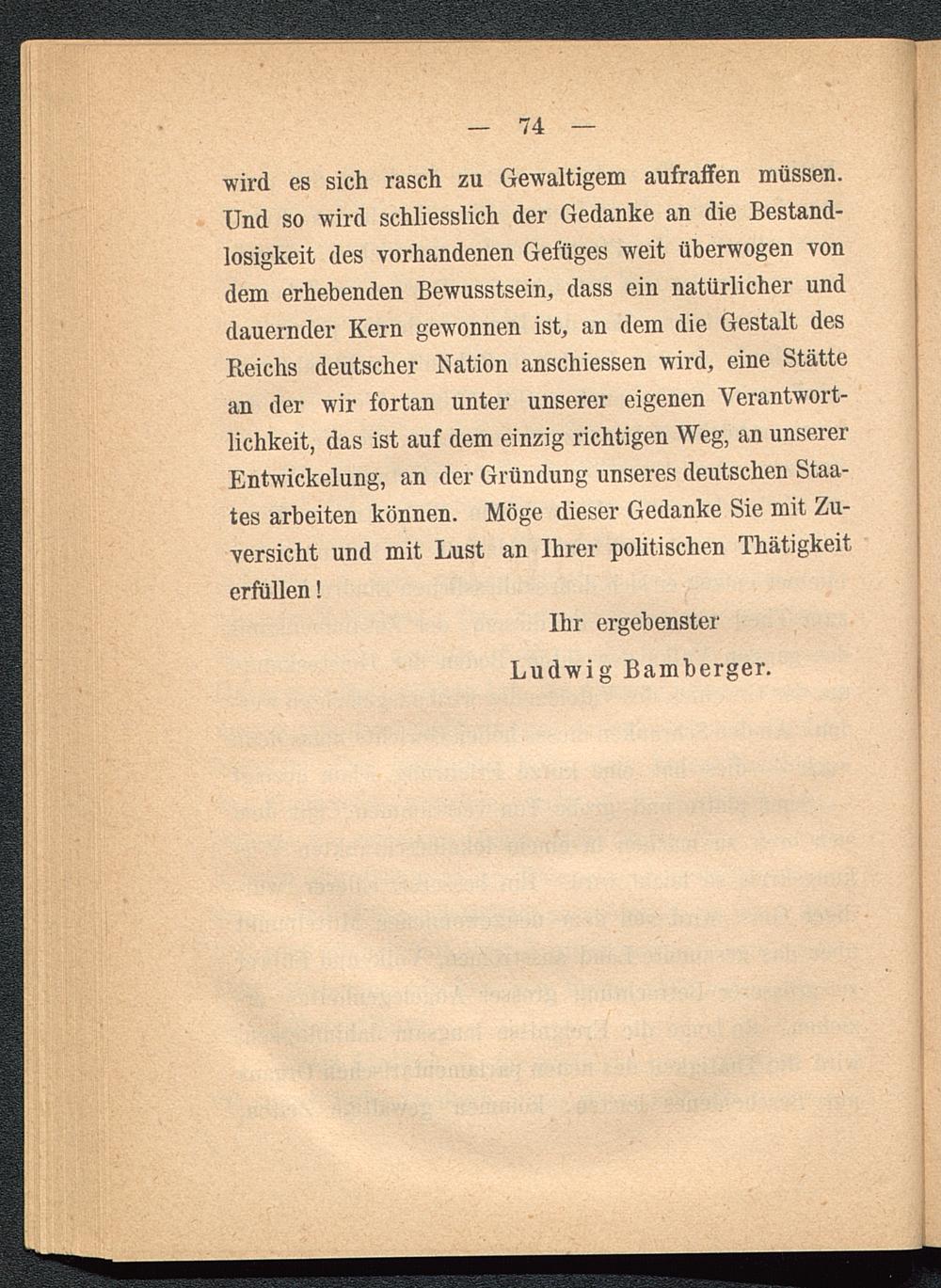 wird es sich rasch zu Gewaltigem aufraffen müssen.Und so wird schliesslich der Gedanke an die Bestand-losigkeit des vorhandenen Gefüges weit überwogen vondem erhebenden Bewusstsein, dass ein natürlicher unddauernder Kern gewonnen ist, an dem die Gestalt desReichs deutscher Nation anschiessen wird, eine Stättean der wir fortan unter unserer eigenen Verantwort-lichkeit, das ist auf dem einzig richtigen Weg, an unsererEntwickelung, an der Gründung unseres deutschen Staa-tes arbeiten können. Möge dieser Gedanke Sie mit Zu-versicht und mit Lust an Ihrer politischen Thätigkeiterfüllen!
