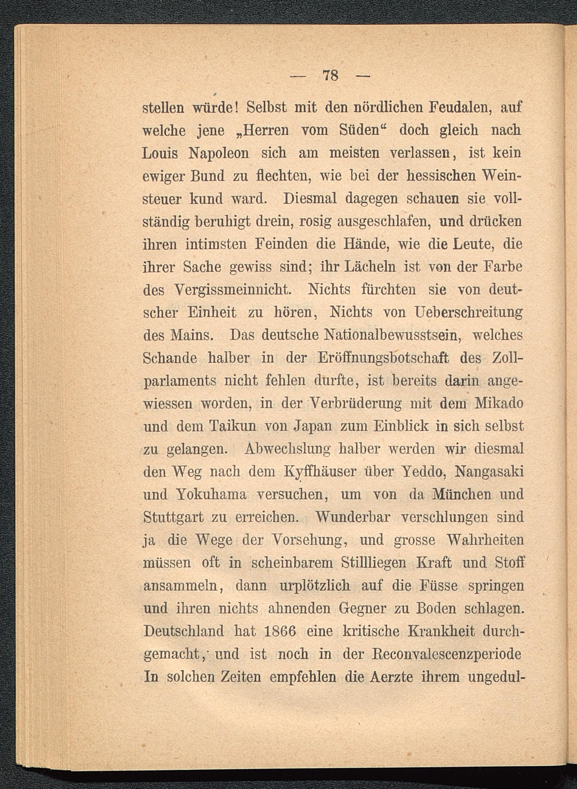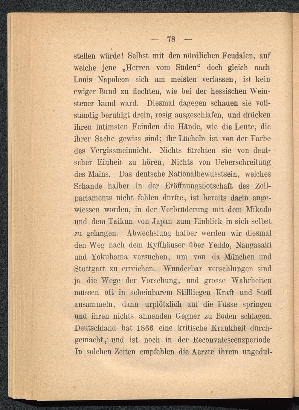 stellen würde! Selbst mit den nördlichen Feudalen, aufwelche jene „Herren vom Süden“ doch gleich nachLouis Napoleon sich am meisten verlassen, ist keinewiger Bund zu flechten, wie bei der hessischen Wein-steuer kund ward. Diesmal dagegen schauen sie voll-ständig beruhigt drein, rosig ausgeschlafen, und drückenihren intimsten Feinden die Hände, wie die Leute, dieihrer Sache gewiss sind; ihr Lächeln ist von der Farbedes Vergissmeinnicht. Nichts fürchten sie von deut-scher Einheit zu hören, Nichts von Ueberschreitungdes Mains. Das deutsche Nationalbewusstsein, welchesSchande halber in der Eröffnungsbotschaft des Zoll-parlaments nicht fehlen durfte, ist bereits darin ange-wiessen worden, in der Verbrüderung mit dem Mikadound dem Taikun von Japan zum Einblick in sich selbstzu gelangen. Abwechslung halber werden wir diesmalden Weg nach dem Kyffhäuser über Yeddo , Nangasakiund Yokuhama versuchen, um von da München undStuttgart zu erreichen. Wunderbar verschlungen sindja die Wege der Vorsehung, und grosse Wahrheitenmüssen oft in scheinbarem Stillliegen Kraft und Stoffansammeln, dann urplötzlich auf die Füsse springenund ihren nichts ahnenden Gegner zu Boden schlagen.Deutschland hat 1866 eine kritische Krankheit durch-gemacht,' und ist noch in der ReconvalcscenzperiodeIn solchen Zeiten empfehlen die Aerzte ihrem ungedul-