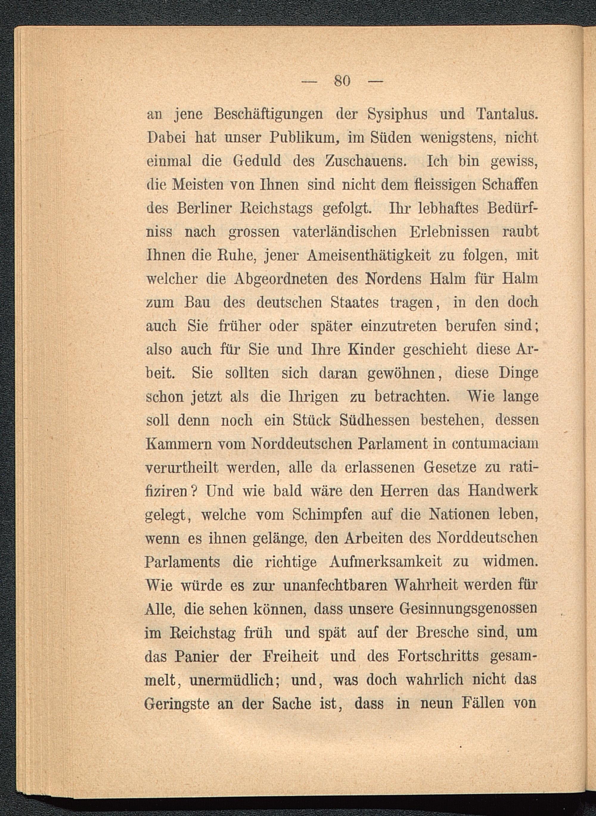 an jene Beschäftigungen (1er Sysiphus und Tantalus .Dabei hat unser Publikum, im Süden wenigstens, nichteinmal die Geduld des Zuschauens. Ich bin gewiss,die Meisten von Ihnen sind nicht dem fleissigen Schaffendes Berliner Reichstags gefolgt. Ihr lebhaftes Bedürf-nis nach grossen vaterländischen Erlebnissen raubtIhnen die Ruhe, jener Ameisenthätigkeit zu folgen, mitwelcher die Abgeordneten des Nordens Halm für Halmzum Bau des deutschen Staates tragen, in den dochauch Sie früher oder später einzutreten berufen sind;also auch für Sie und Ihre Kinder geschieht diese Ar-beit. Sie sollten sich daran gewöhnen, diese Dingeschon jetzt als die Ihrigen zu betrachten. Wie langesoll denn noch ein Stück Südhessen bestehen, dessenKammern vom Norddeutschen Parlament in contumaciamverurtheilt werden, alle da erlassenen Gesetze zu rati-fiziren? Und wie bald wäre den Herren das Handwerkgelegt, welche vom Schimpfen auf die Nationen leben,wenn es ihnen gelänge, den Arbeiten des NorddeutschenParlaments die richtige Aufmerksamkeit zu widmen.Wie würde es zur unanfechtbaren Wahrheit werden fürAlle, die sehen können, dass unsere Gesinnungsgenossenim Reichstag früh und spät auf der Bresche sind, umdas Panier der Freiheit und des Fortschritts gesam-melt, unermüdlich; und, was doch wahrlich nicht dasGeringste an der Sache ist, dass in neun Fällen von