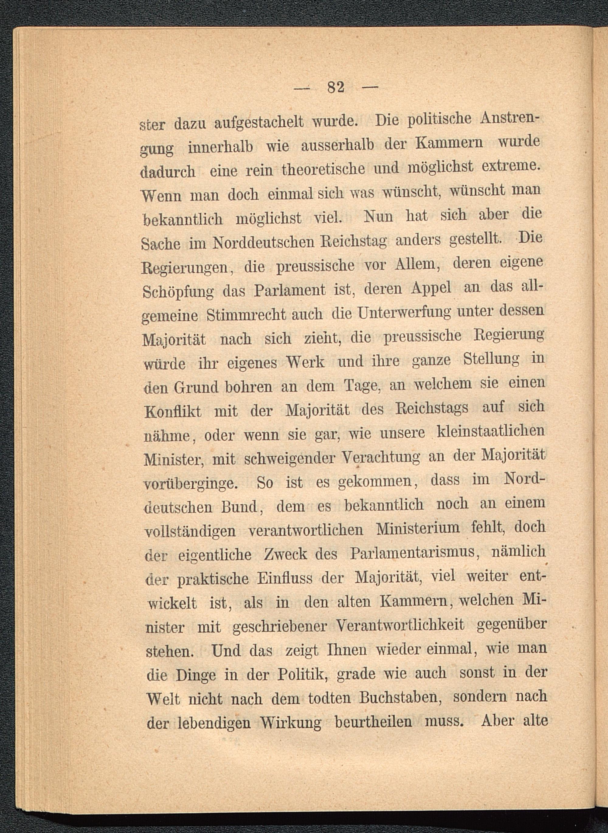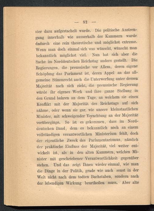 ster dazu aufgestachelt wurde. Die politische Anstren-gung innerhalb wie ausserhalb der Kammern wurdedadurch eine rein theoretische und möglichst extreme.Wenn man doch einmal sich was wünscht, wünscht manbekanntlich möglichst viel. Nun hat sich aber dieSache im Norddeutschen Reichstag anders gestellt. DieRegierungen, die preussische vor Allem, deren eigeneSchöpfung das Parlament ist, deren Appel an das all-gemeine Stimmrecht auch die Unterwerfung unter dessenMajorität nach sich zieht, die preussische Regierungwürde ihr eigenes Werk und ihre ganze Stellung inden Grund bohren an dem Tage, an welchem sie einenKonflikt mit der Majorität des Reichstags auf sichnähme, oder wenn sie gar, wie unsere kleinstaatlichenMinister, mit schweigender Verachtung an der Majoritätvorüberginge. So ist es gekommen, dass im Nord-deutschen Bund , dem es bekanntlich noch an einemvollständigen verantwortlichen Ministerium fehlt, dochder eigentliche Zweck des Parlamentarismus, nämlichder praktische Einfluss der Majorität, viel weiter ent-wickelt ist, als in den alten Kammern, welchen Mi-nister mit geschriebener Verantwortlichkeit gegenüberstehen. Und das zeigt Ihnen wieder einmal, wie mandie Dinge in der Politik, grade wie auch sonst in derWelt nicht nach dem todten Buchstaben, sondern nachder lebendigen Wirkung beurtheilen muss. Aber alte