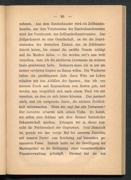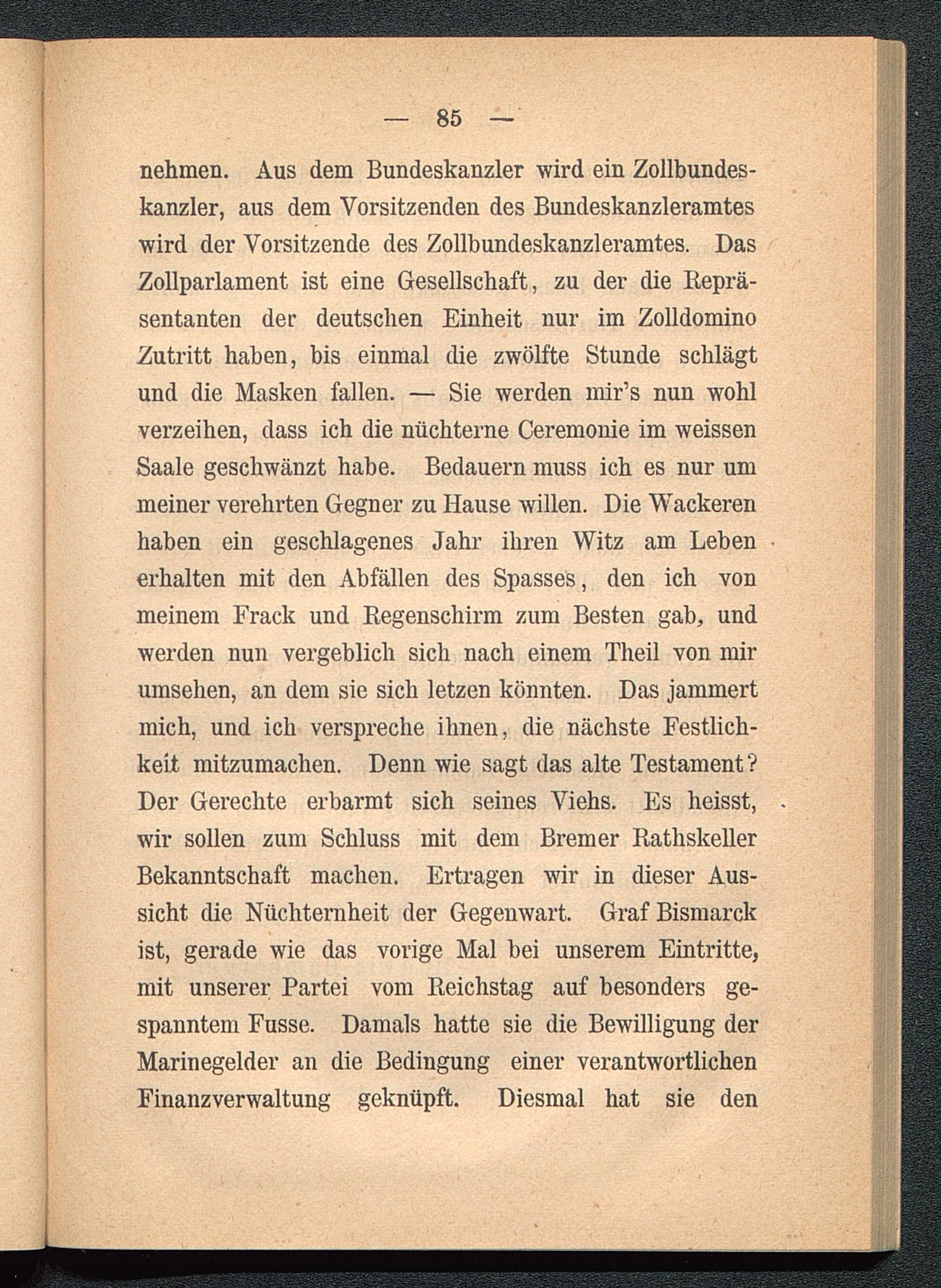 nehmen. Aus dem Bundeskanzler wird ein Zollbundes-kanzler, aus dem Vorsitzenden des Bundeskanzleramteswird der Vorsitzende des Zollbundeskanzleramtes. DasZollparlament ist eine Gesellschaft, zu der die Reprä-sentanten der deutschen Einheit nur im ZolldominoZutritt haben, bis einmal die zwölfte Stunde schlägtund die Masken fallen. — Sie werden mir’s nun wohlverzeihen, dass ich die nüchterne Ceremonie im weissenSaale geschwänzt habe. Bedauern muss ich es nur ummeiner verehrten Gegner zu Hause willen. Die Wackerenhaben ein geschlagenes Jahr ihren Witz am Lebenerhalten mit den Abfällen des Spasses, den ich vonmeinem Frack und Begenschirm zum Besten gab, undwerden nun vergeblich sich nach einem Theil von mirumsehen, an dem sie sich letzen könnten. Das jammertmich, und ich verspreche ihnen, die nächste Festlich-keit mitzumachen. Denn wie sagt das alte Testament?Der Gerechte erbarmt sich seines Viehs. Es heisst,wir sollen zum Schluss mit dem Bremer RathskellerBekanntschaft machen. Ertragen wir in dieser Aus-sicht die Nüchternheit der Gegenwart. Graf Bismarckist, gerade wie das vorige Mal bei unserem Eintritte,mit unserer Partei vom Reichstag auf besonders ge-spanntem Fusse. Damals hatte sie die Bewilligung derMarinegelder an die Bedingung einer verantwortlichenFinanzverwaltung geknüpft. Diesmal hat sie den