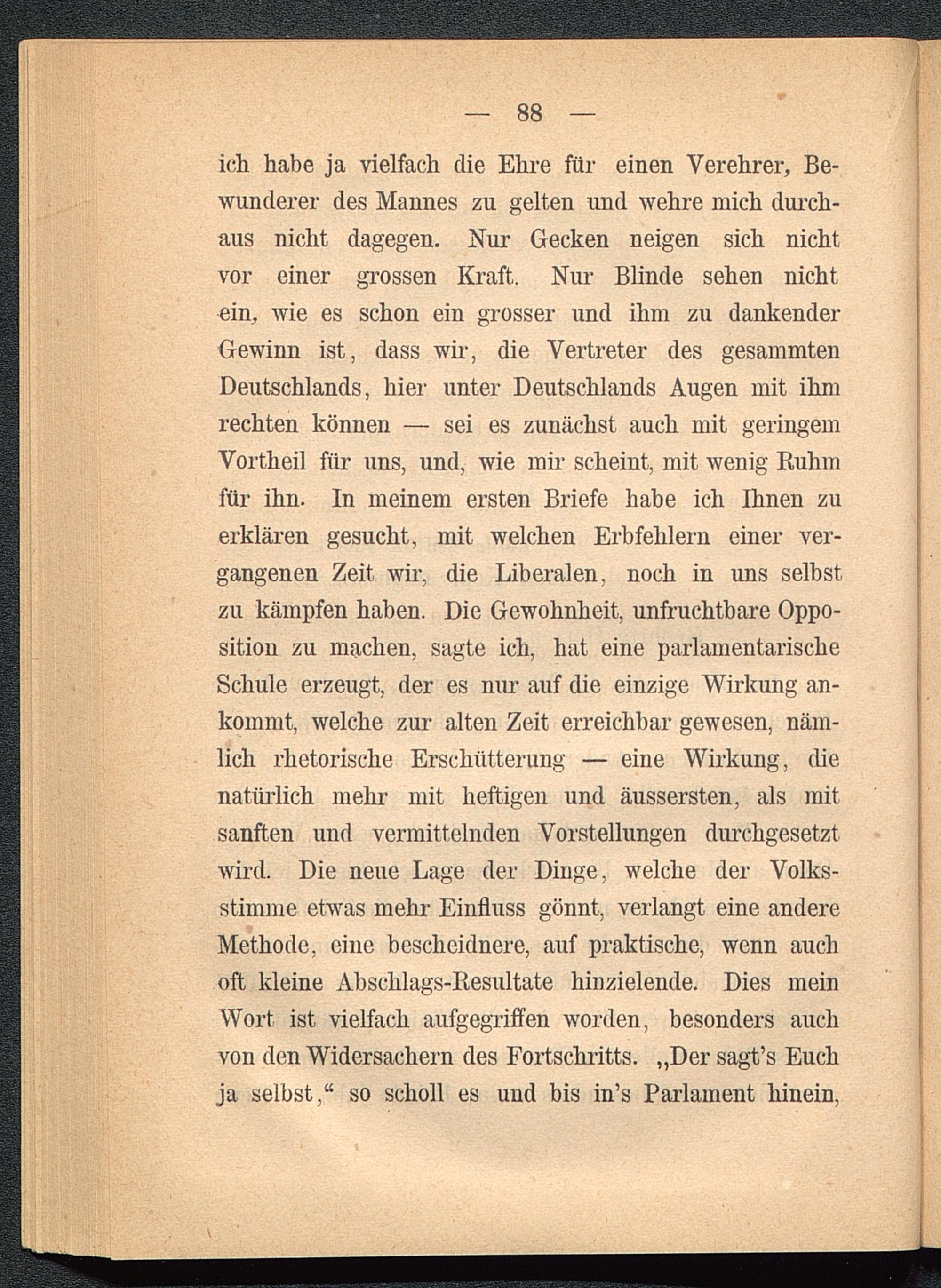 ich habe ja vielfach die Ehre für einen Verehrer, Be-wunderer des Mannes zu gelten und wehre mich durch-aus nicht dagegen. Nur Gecken neigen sich nichtvor einer grossen Kraft. Nur Blinde sehen nichtein, wie es schon ein grosser und ihm zu dankenderGewinn ist, dass wir, die Vertreter des gesammtenDeutschlands, hier unter Deutschlands Augen mit ihmrechten können — sei es zunächst auch mit geringemVortheil für uns, und, wie mir scheint, mit wenig Ruhmfür ihn. In meinem ersten Briefe habe ich Ihnen zuerklären gesucht, mit welchen Erbfehlern einer ver-gangenen Zeit wir. die Liberalen, noch in uns selbstzu kämpfen haben. Die Gewohnheit, unfruchtbare Oppo-sition zu machen, sagte ich, hat eine parlamentarischeSchule erzeugt, der es nur auf die einzige Wirkung an-kommt, welche zur alten Zeit erreichbar gewesen, näm-lich rhetorische Erschütterung — eine Wirkung, dienatürlich mehr mit heftigen und äussersten, als mitsanften und vermittelnden Vorstellungen durchgesetztwird. Die neue Lage der Dinge, welche der Volks-stimme etwas mehr Einfluss gönnt, verlangt eine andereMethode, eine bescheidnere, auf praktische, wenn auchoft kleine Abschlags-Resultate hinzielende. Dies meinWort ist vielfach aufgegriffen worden, besonders auchvon den Widersachern des Fortschritts. „Der sagt’s Euchja selbst,“ so scholl es und bis in’s Parlament hinein,