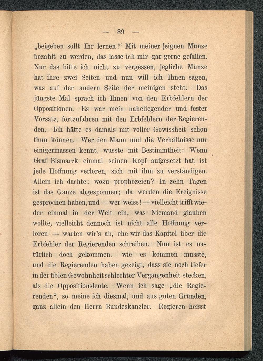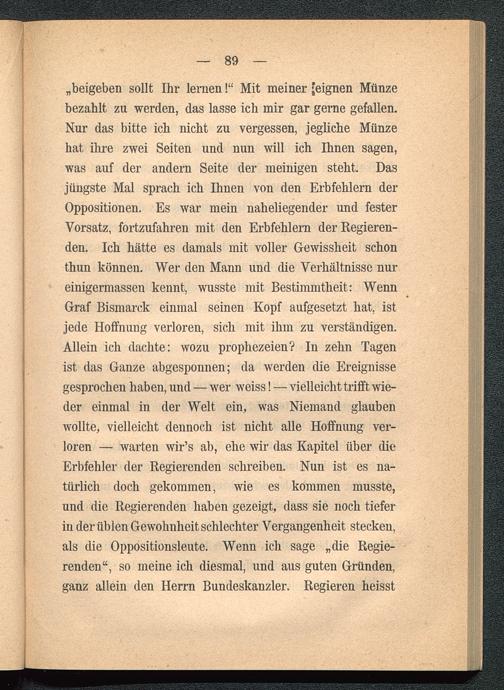 „beigeben sollt Ihr lernen!“ Mit meiner ^eignen Münzebezahlt zu werden, das lasse ich mir gar gerne gefallen.Nur das bitte ich nicht zu vergessen, jegliche Münzehat ihre zwei Seiten und nun will ich Ihnen sagen,was auf der andern Seite der meinigen steht. Dasjüngste Mal sprach ich Ihnen von den Erbfehlern derOppositionen. Es war mein naheliegender und festerVorsatz, fortzufahren mit den Erbfehlern der Regieren-den. Ich hätte es damals mit voller Gewissheit schonthun können. Wer den Mann und die Verhältnisse nureinigermassen kennt, wusste mit Bestimmtheit: WennGraf Bismarck einmal seinen Kopf aufgesetzt hat, istjede Hoffnung verloren, sich mit ihm zu verständigen.Allein ich dachte: wozu prophezeien? In zehn Tagenist das Ganze abgesponnen; da werden die Ereignissegesprochen haben, und — wer weiss! — vielleicht trifft wie-der einmal in der Welt ein, was Niemand glaubenwollte, vielleicht dennoch ist nicht alle Hoffnung ver-loren — warten wir’s ab, ehe wir das Kapitel über dieErbfehler der Regierenden schreiben. Nun ist es na-türlich doch gekommen, wie es kommen musste,und die Regierenden haben gezeigt, dass sie noch tieferin der üblen Gewohnheit schlechter Vergangenheit stecken,als die Oppositionsleute. Wenn ich sage „die Regie-renden“, so meine ich diesmal, und aus guten Gründen,ganz allein den Herrn Bundeskanzler. Regieren heisst