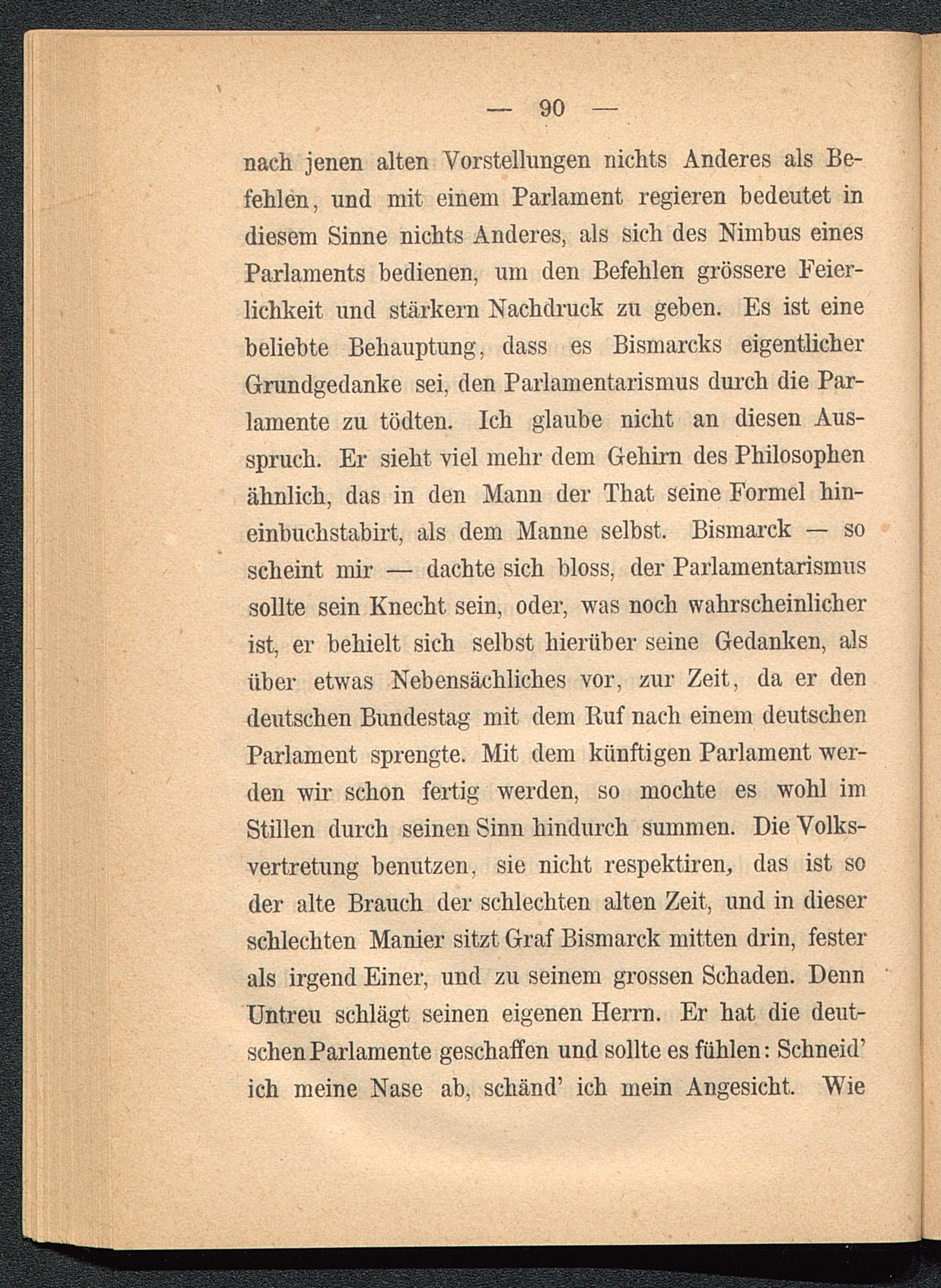 nach jenen alten Vorstellungen nichts Anderes als Be-fehlen, und mit einem Parlament regieren bedeutet indiesem Sinne nichts Anderes, als sich des Nimbus einesParlaments bedienen, um den Befehlen grössere Feier-lichkeit und stärkern Nachdruck zu geben. Es ist einebeliebte Behauptung, dass es Bismarcks eigentlicherGrundgedanke sei, den Parlamentarismus durch die Par-lamente zu tödten. Ich glaube nicht an diesen Aus-spruch. Er sieht viel mehr dem Gehirn des Philosophenähnlich, das in den Mann der That seine Formel hin-einbuchstabirt, als dem Manne selbst. Bismarck — soscheint mir — dachte sich bloss, der Parlamentarismus sollte sein Knecht sein, oder, was noch wahrscheinlicherist, er behielt sich selbst hierüber seine Gedanken, alsüber etwas Nebensächliches vor, zur Zeit, da er dendeutschen Bundestag mit dem Ruf nach einem deutschenParlament sprengte. Mit dem künftigen Parlament wer-den wir schon fertig werden, so mochte es wohl imStillen durch seinen Sinn hindurch summen. Die Volks-vertretung benutzen, sie nicht respektiren, das ist soder alte Brauch der schlechten alten Zeit, und in dieserschlechten Manier sitzt Graf Bismarck mitten drin, festerals irgend Einer, und zu seinem grossen Schaden. DennUntreu schlägt seinen eigenen Herrn. Er hat die deut-schen Parlamente geschaffen und sollte es fühlen: Schneid’ich meine Nase ab, schänd’ ich mein Angesicht. Wie