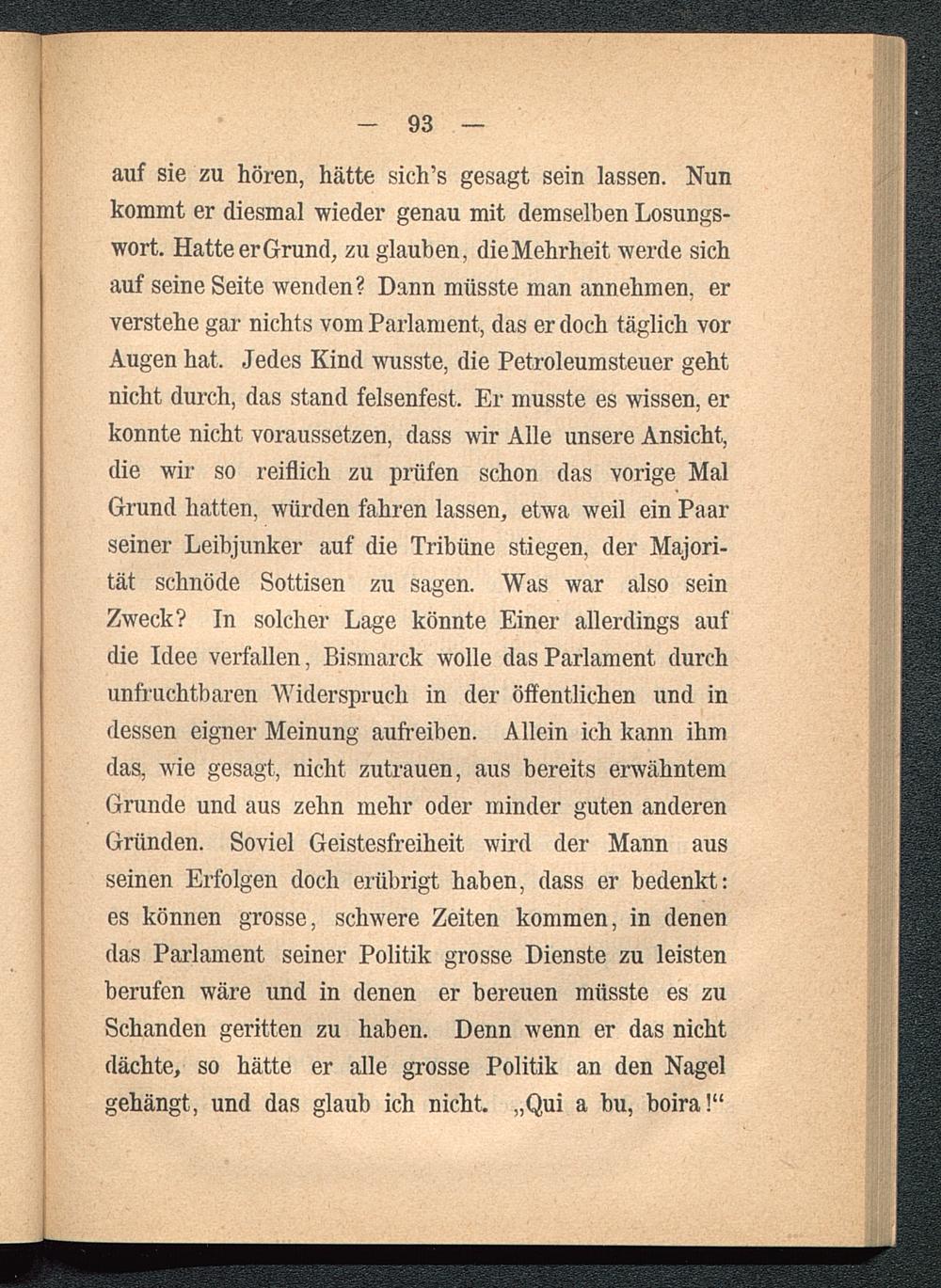 auf sie zu hören, hätte sich’s gesagt sein lassen. Nunkommt er diesmal wieder genau mit demselben Losungs-wort. Hatte er Grund, zu glauben, dieMehrheit werde sichauf seine Seite wenden? Dann müsste man annehmen, erverstehe gar nichts vom Parlament, das er doch täglich vorAugen hat. Jedes Kind wusste, die Petroleumsteuer gehtnicht durch, das stand felsenfest. Er musste es wissen, erkonnte nicht voraussetzen, dass wir Alle unsere Ansicht,die wir so reiflich zu prüfen schon das vorige MalGrund hatten, würden fahren lassen, etwa weil ein Paarseiner Leibjunker auf die Tribüne stiegen, der Majori-tät schnöde Sottisen zu sagen. Was war also seinZweck? In solcher Lage könnte Einer allerdings aufdie Idee verfallen, Bismarck wolle das Parlament durchunfruchtbaren Widerspruch in der öffentlichen und indessen eigner Meinung aufreiben. Allein ich kann ihmdas, wie gesagt, nicht Zutrauen, aus bereits erwähntemGrunde und aus zehn mehr oder minder guten anderenGründen. Soviel Geistesfreiheit wird der Mann ausseinen Erfolgen doch erübrigt haben, dass er bedenkt:es können grosse, schwere Zeiten kommen, in denendas Parlament seiner Politik grosse Dienste zu leistenberufen wäre und in denen er bereuen müsste es zuSchanden geritten zu haben. Denn wenn er das nichtdächte, so hätte er alle grosse Politik an den Nagelgehängt, und das glaub ich nicht. „Qui a bu, boira!“