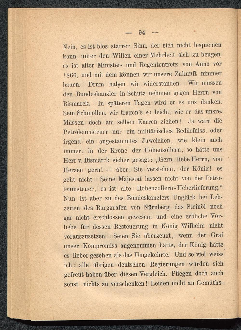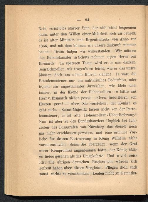 Nein, es ist blos starrer Sinn, der sieb nicht bequemenkann, unter den Willen einer Mehrheit sich zu beugen,es ist alter Minister- und Regententrotz von Anno vor1866, und mit dem können wir unsere Zukunft nimmerbauen. Drum haben wir widerstanden. Wir müssenden Bundeskanzler in Schutz nehmen gegen Herrn vonBismarck. In späteren Tagen Avird er es uns danken.Sein Schmollen, wir tragen’s so leicht, wie er das unsre.Müssen doch am selben Karren ziehen! Ja wäre diePetroleumsteuer nur ein militärisches Bedürfniss, oderirgend ein angestammtes Jmvelchen. wie klein auchimmer, in der Krone der Hohenzollern , so hätte unsHerr v. Bismarck sicher gesagt: „Gern, liebe Herrn, vonHerzen gern! — aber, Sie verstehen, der König! esgeht nicht. Seine Majestät lassen nicht von der Petro-leumsteuer, es ist alte Hohenzollern -Ueberlieferung.“Nun ist aber zu des Bundeskanzlers Unglück bei Leb-zeiten des Burggrafen von Nürnberg das Steinöl nochgar nicht erschlossen geAvesen, und eine erbliche Vor-liebe für dessen Besteuerung in König Wilhelm nichtvorauszusetzen. Seien Sie überzeugt, Avenn der Grafunser Kompromiss angenommen hätte, der König hättees lieber gesehen als das Umgekehrte. Und so viel weissich: alle übrigen deutschen Regierungen würden sichgefreut haben über diesen Vergleich. Pflegen doch auchsonst nichts zu verschenken! Leiden nicht an Gemüths-