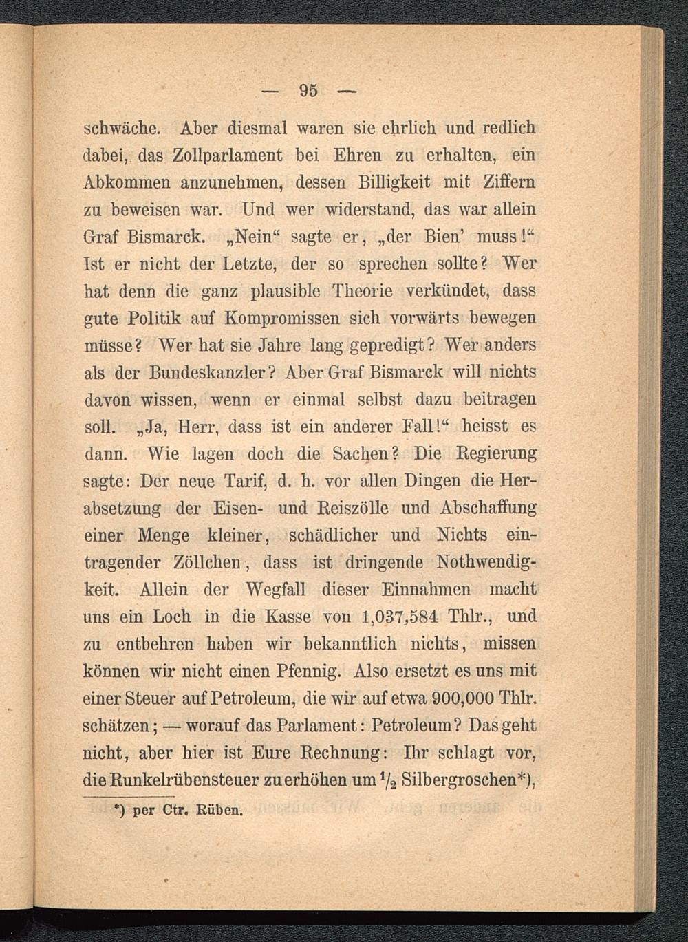 schwäche. Aber diesmal waren sie ehrlich und redlichdabei, das Zollparlament bei Ehren zu erhalten, einAbkommen anzunehmen, dessen Billigkeit mit Ziffernzu beweisen war. Und wer widerstand, das war alleinGraf Bismarck. „Nein“ sagte er, „der Bien’ muss!“Ist er nicht der Letzte, der so sprechen sollte? Werhat denn die ganz plausible Theorie verkündet, dassgute Politik auf Kompromissen sich vorwärts bewegenmüsse? Wer hat sie Jahre lang gepredigt? Wer andersals der Bundeskanzler? Aber Graf Bismarck will nichtsdavon wissen, wenn er einmal selbst dazu beitragensoll. „Ja, Herr, dass ist ein anderer Fall!“ heisst esdann. Wie lagen doch die Sachen? Die Regierungsagte: Der neue Tarif, d. h. vor allen Dingen die Her-absetzung der Eisen- und Reiszölle und Abschaffungeiner Menge kleiner, schädlicher und Nichts ein-tragender Zöllchen, dass ist dringende Nothwendig-keit. Allein der Wegfall dieser Einnahmen machtuns ein Loch in die Kasse von 1,037,584 Thlr., undzu entbehren haben wir bekanntlich nichts, missenkönnen wir nicht einen Pfennig. Also ersetzt es uns miteinerSteuer auf Petroleum , die wir auf etwa 900,000 Thlr.schätzen; — worauf das Parlament: Petroleum? Das gehtnicht, aber hier ist Eure Rechnung: Ihr schlagt vor,die Runkelrübensteuer zu erhöhen um ‘/ä Silbergroschen*),