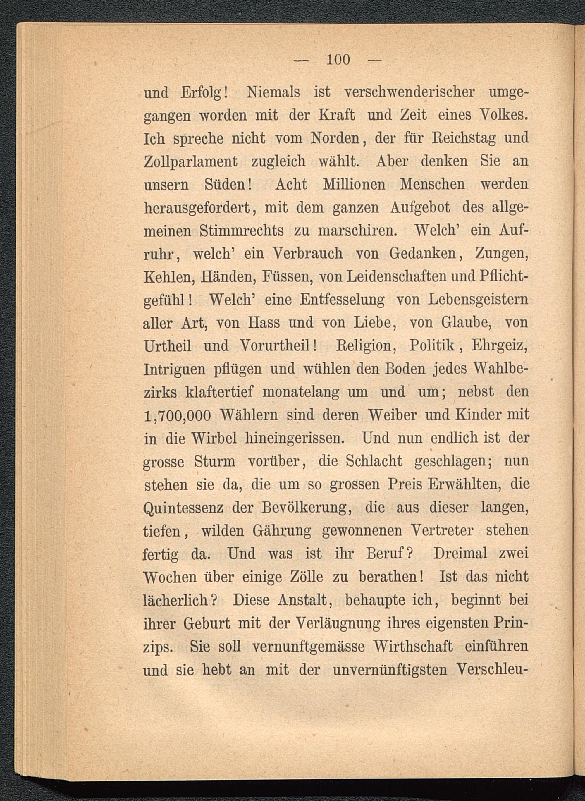 und Erfolg! Niemals ist verschwenderischer umge-gangen worden mit der Kraft und Zeit eines Volkes.Ich spreche nicht vom Norden, der für Reichstag undZollparlament zugleich wählt. Aber denken Sie anunsern Süden! Acht Millionen Menschen werdenherausgefordert, mit dem ganzen Aufgebot des allge-meinen Stimmrechts zu marschiren. Welch’ ein Auf-ruhr, welch’ ein Verbrauch von Gedanken, Zungen,Kehlen, Händen, Füssen , von Leidenschaften und Pflicht-gefühl ! Welch’ eine Entfesselung von Lebensgeisternaller Art, von Hass und von Liebe, von Glaube, vonUrtheil und Vorurtheil! Religion, Politik, Ehrgeiz,Intriguen pflügen und wühlen den Boden jedes Wahlbe-zirks klaftertief monatelang um und um; nebst den1,700,000 Wählern sind deren Weiber und Kinder mitin die Wirbel hineingerissen. Und nun endlich ist dergrosse Sturm vorüber, die Schlacht geschlagen; nunstehen sie da, die um so grossen Preis Erwählten, dieQuintessenz der Bevölkerung, die aus dieser langen,tiefen, wilden Gährung gewonnenen Vertreter stehenfertig da. Und was ist ihr Beruf? Dreimal zweiWochen über einige Zölle zu berathen! Ist das nichtlächerlich? Diese Anstalt, behaupte ich, beginnt beiihrer Geburt mit der Verläugnung ihres eigensten Prin-zips. Sie soll vernunftgemässe Wirthschaft einführenund sie hebt an mit der unvernünftigsten Verschleu-
