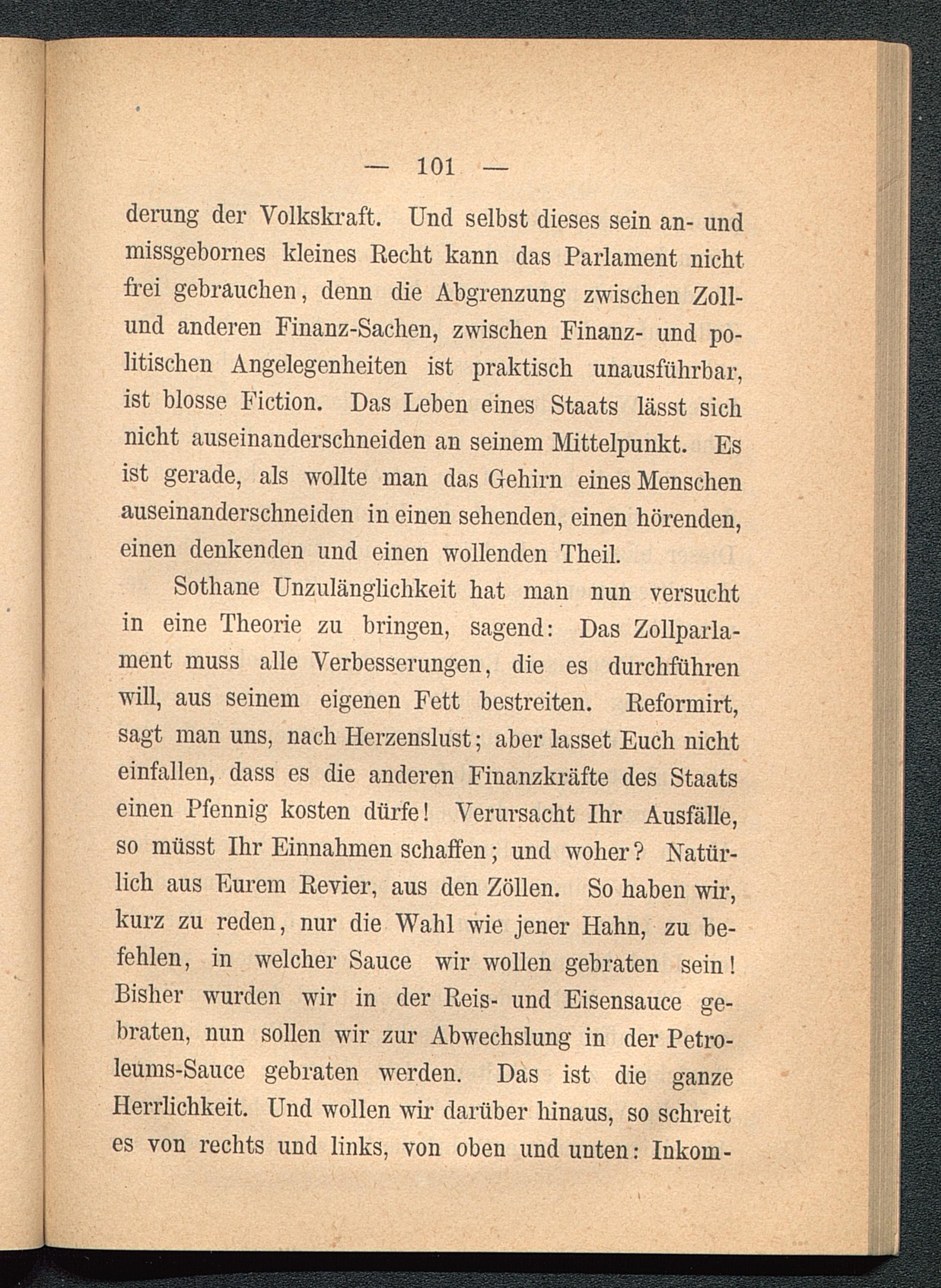 Sothane Unzulänglichkeit hat man nun versuchtin eine Theorie zu bringen, sagend: Das Zollparla-ment muss alle Verbesserungen, die es durchführenwill, aus seinem eigenen Fett bestreiten. Reformirt,sagt man uns, nach Herzenslust; aber lasset Euch nichteinfallen, dass es die anderen Finanzkräfte des Staatseinen Pfennig kosten dürfe! Verursacht Ihr Ausfälle,so müsst Ihr Einnahmen schaffen; und woher? Natür-lich aus Eurem Revier, aus den Zöllen. So haben wir,kurz zu reden, nur die Wahl wie jener Hahn, zu be-fehlen, in welcher Sauce wir wollen gebraten sein!Bisher wurden wir in der Reis- und Eisensauce ge-braten, nun sollen wir zur Abwechslung in der Petro-leums-Sauce gebraten werden. Das ist die ganzeHerrlichkeit. Und wollen wir darüber hinaus, so schreites von rechts und links, von oben und unten: Inkom-
