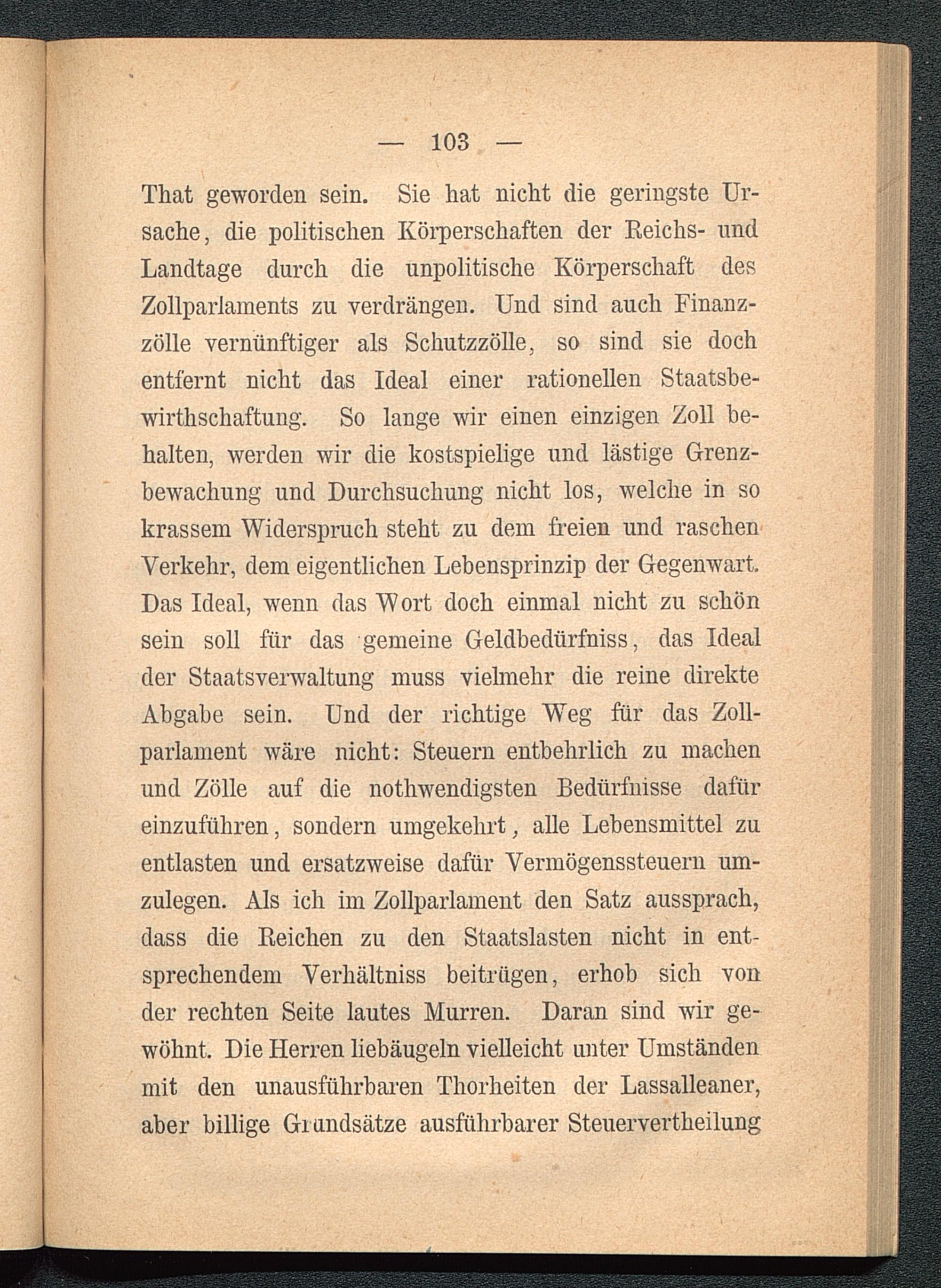 That geworden sein. Sie hat nicht die geringste Ur-sache, die politischen Körperschaften der Reichs- nndLandtage durch die unpolitische Körperschaft desZollparlaments zu verdrängen. Und sind auch Finanz-zölle vernünftiger als Schutzzölle, so sind sie dochentfernt nicht das Ideal einer rationellen Staatsbe-wirthschaftung. So lange wir einen einzigen Zoll be-halten, werden wir die kostspielige und lästige Grenz-bewachung und Durchsuchung nicht los, welche in sokrassem Widerspruch steht zu dem freien und raschenVerkehr, dem eigentlichen Lebensprinzip der Gegenwart.Das Ideal, wenn das Wort doch einmal nicht zu schönsein soll für das gemeine Geldbedürfniss, das Idealder Staatsverwaltung muss vielmehr die reine direkteAbgabe sein. Und der richtige Weg für das Zoll-parlament wäre nicht: Steuern entbehrlich zu machenund Zölle auf die nothwendigsten Bedürfnisse dafüreinzuführen, sondern umgekehrt, alle Lebensmittel zuentlasten und ersatzweise dafür Vermögenssteuern um-zulegen. Als ich im Zollparlament den Satz aussprach,dass die Reichen zu den Staatslasten nicht in ent-sprechendem Verhältnis beitrügen, erhob sich vonder rechten Seite lautes Murren. Daran sind wir ge-wöhnt. Die Herren liebäugeln vielleicht unter Umständenmit den unausführbaren Thorheiten der Lassalleaner,aber billige Gr undsätze ausführbarer Steuervertheilung