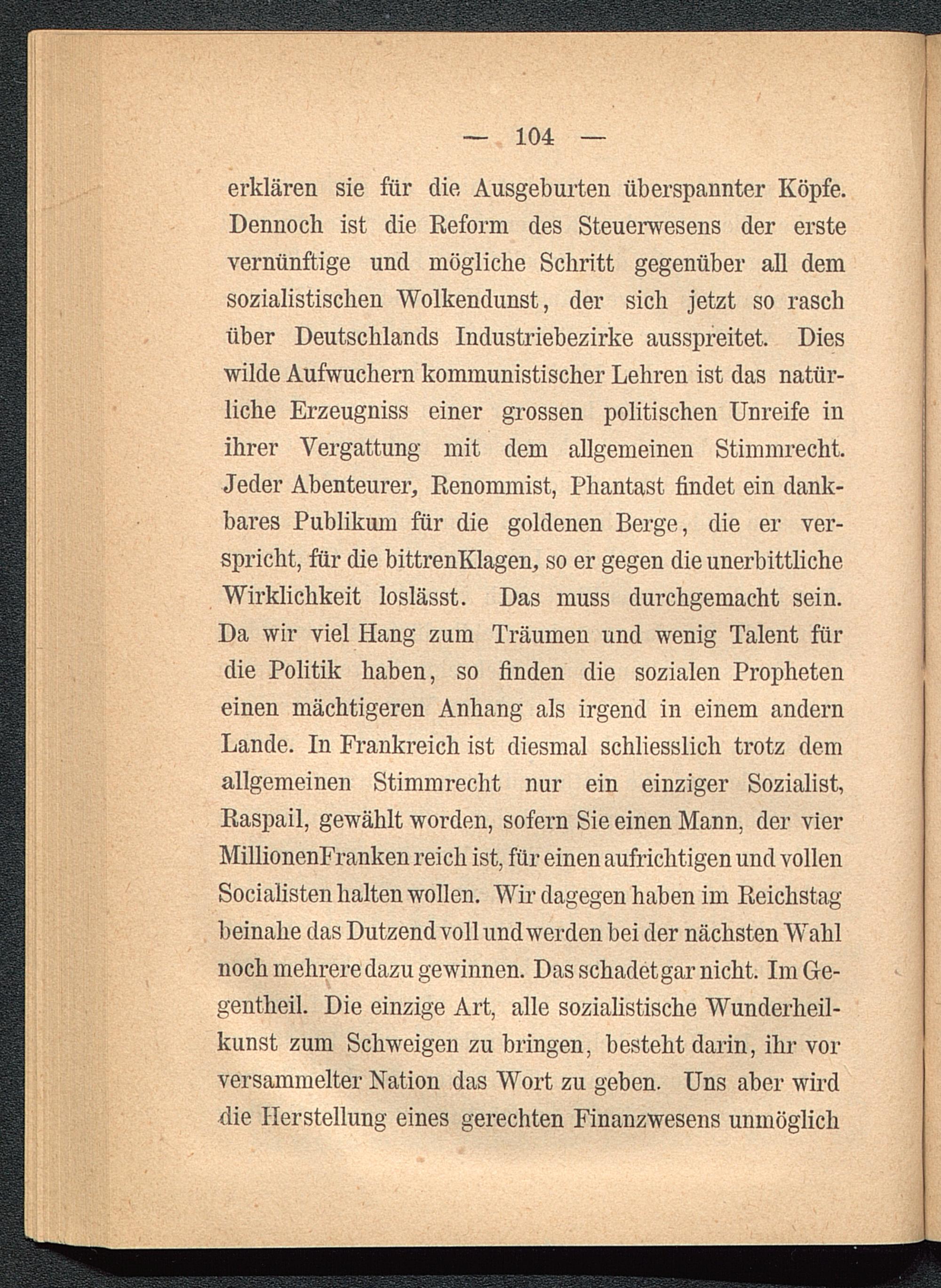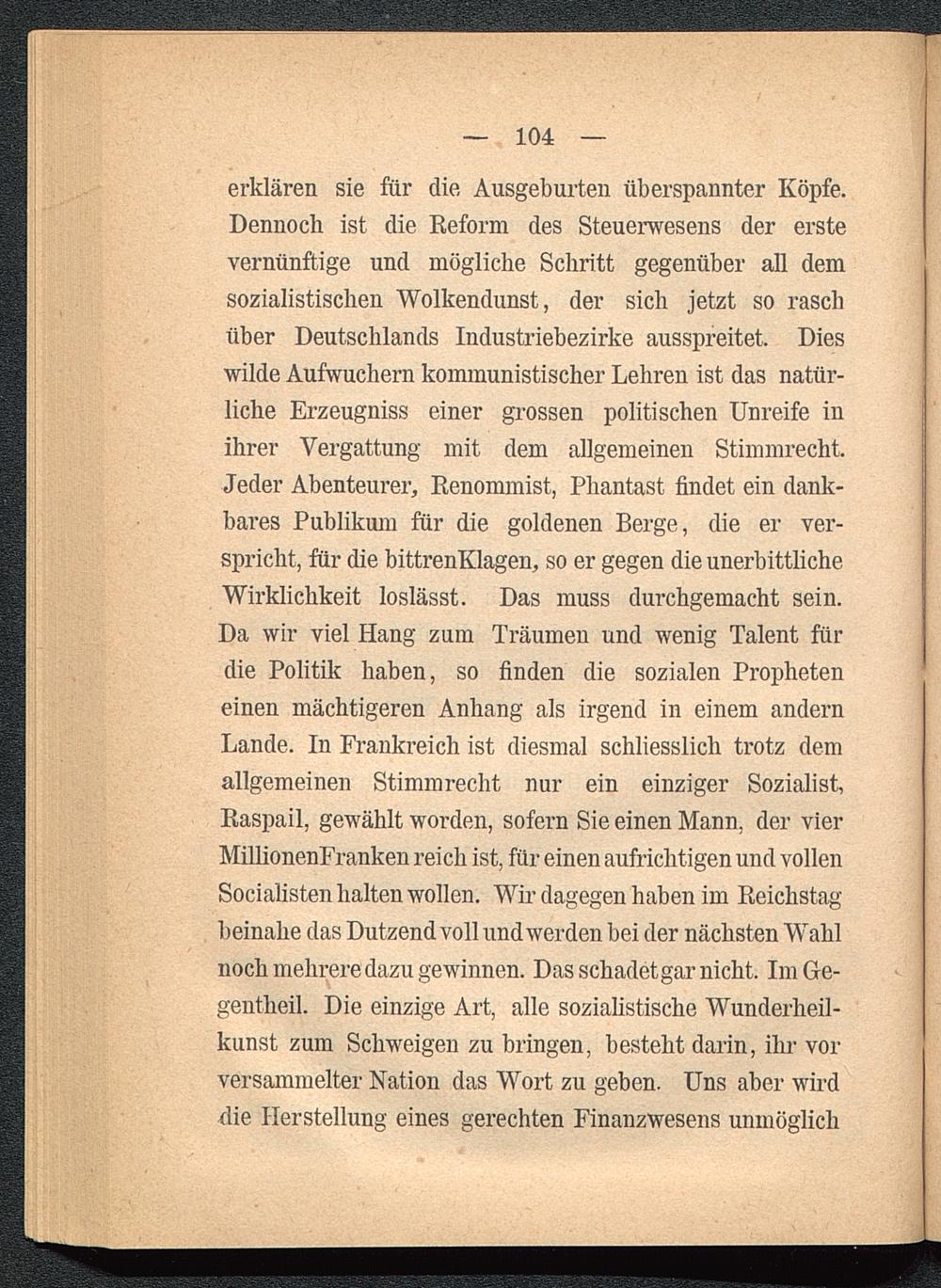 erklären sie für die Ausgeburten überspannter Köpfe.Dennoch ist die Reform des Steuerwesens der erstevernünftige und mögliche Schritt gegenüber all demsozialistischen Wolkendunst, der sich jetzt so raschüber Deutschlands Industriebezirke ausspreitet. Dieswilde Aufwuchern kommunistischer Lehren ist das natür-liche Erzeugniss einer grossen politischen Unreife inihrer Vergattung mit dem allgemeinen Stimmrecht,Jeder Abenteurer, Renommist, Phantast findet ein dank-bares Publikum für die goldenen Berge, die er ver-spricht, für die bittrenKIagen, so er gegen die unerbittlicheWirklichkeit loslässt. Das muss durchgemacht sein.Da wir viel Hang zum Träumen und wenig Talent fürdie Politik haben, so finden die sozialen Propheteneinen mächtigeren Anhang als irgend in einem andernLande. In Frankreich ist diesmal schliesslich trotz demallgemeinen Stimmrecht nur ein einziger Sozialist,Raspail, gewählt worden, sofern Sie einen Mann, der vierMillionenFranken reich ist, für einen aufrichtigen und vollenSocialisten halten wollen. Wir dagegen haben im Reichstagbeinahe das Dutzend voll und werden bei der nächsten Wahlnoch mehrere dazu gewinnen. Das schadet gar nicht. Im Ge-gentheil. Die einzige Art, alle sozialistische Wunderheil-kunst zum Schweigen zu bringen, besteht darin, ihr vorversammelter Nation das Wort zu geben. Uns aber wirddie Herstellung eines gerechten Finanzwesens unmöglich
