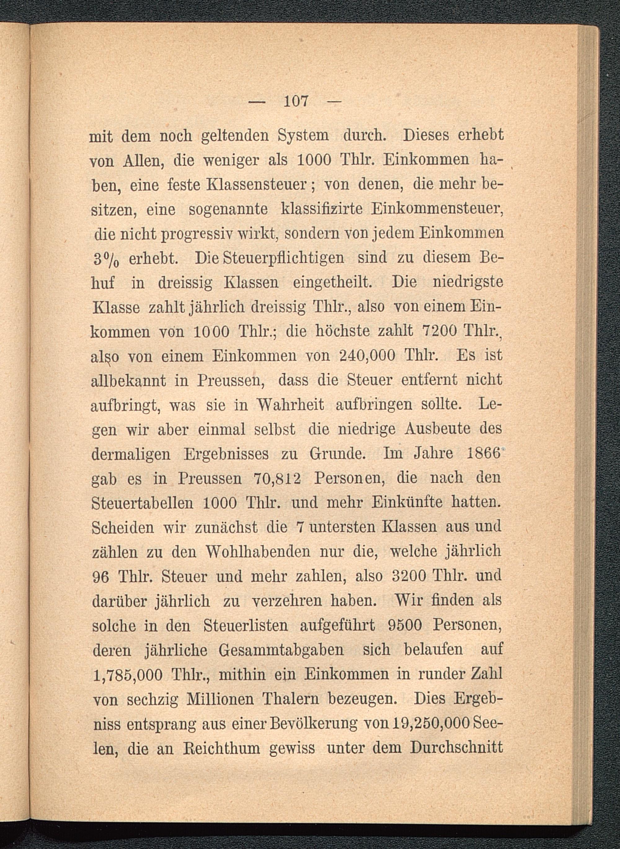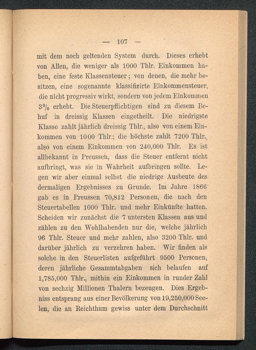 mit dem noch geltenden System durch. Dieses erhebtvon Allen, die weniger als 1000 Thlr. Einkommen ha-ben, eine feste Klassensteuer ; von denen, die mehr be-sitzen, eine sogenannte klassifizirte Einkommensteuer,die nicht progressiv wirkt, sondern von jedem Einkommen3% erhebt. Die Steuerpflichtigen sind zu diesem Be-huf in dreissig Klassen eingetheilt. Die niedrigsteKlasse zahlt jährlich dreissig Thlr., also von einem Ein-kommen von 1000 Thlr. ; die höchste zahlt 7200 Thlr.,al^o von einem Einkommen von 240,000 Thlr. Es istallbekannt in Preussen , dass die Steuer entfernt nichtaufbringt, was sie in Wahrheit aufbringen sollte. Le-gen wir aber einmal selbst die niedrige Ausbeute desdermaligen Ergebnisses zu Grunde. Im Jahre 1866gab es in Preussen 70,812 Personen, die nach denSteuertabellen 1000 Thlr. und mehr Einkünfte hatten.Scheiden wir zunächst die 7 untersten Klassen aus undzählen zu den Wohlhabenden nur die, welche jährlich96 Thlr. Steuer und mehr zahlen, also 3200 Thlr. unddarüber jährlich zu verzehren haben. Wir finden alssolche in den Steuerlisten aufgeführt 9500 Personen,deren jährliche Gesammtabgaben sich belaufen auf1,785,000 Thlr., mithin ein Einkommen in runder Zahlvon sechzig Millionen Thalern bezeugen. Dies Ergeb-nis entsprang aus einer Bevölkerung von 19,250,000 See-len, die an Reichthum gewiss unter dem Durchschnitt