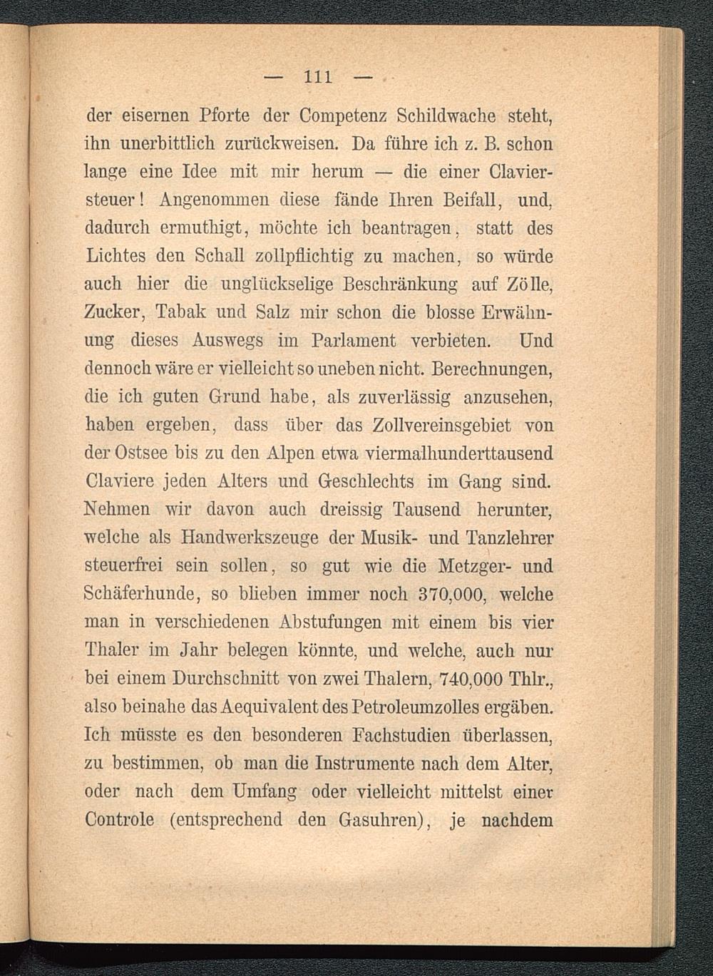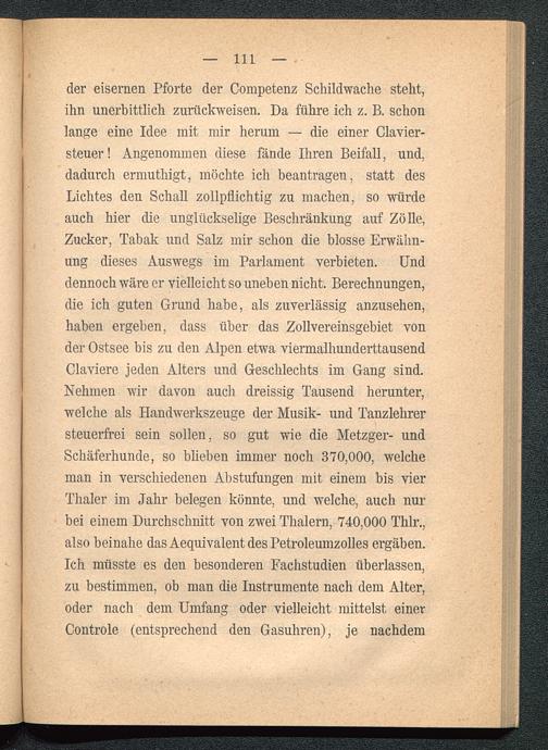 der eisernen Pforte der Competenz Schildwache steht,ihn unerbittlich zuriickweisen. Da führe ich z. B. schonlange eine Idee mit mir herum — die einer Clavier-steuer! Angenommen diese fände Ihren Beifall, und.dadurch ermutliigt, möchte ich beantragen, statt desLichtes den Schall zollpflichtig zu machen, so würdeauch hier die unglückselige Beschränkung auf Zölle,Zucker, Tabak und Salz mir schon die blosse Erwähn-ung dieses Auswegs im Parlament verbieten. Unddennoch wäre er vielleicht so uneben nicht. Berechnungen,die ich guten Grund habe, als zuverlässig anzusehen,haben ergehen, dass über das Zollvereinsgebiet vonder Ostsee bis zu den Alpen etwa ViermalhunderttausendClaviere jeden Alters und Geschlechts im Gang sind.Nehmen wir davon auch dreissig Tausend herunter,welche als Handwerkszeuge der Musik- und Tanzlehrersteuerfrei sein sollen, so gut wie die Metzger- undSchäferhunde, so blieben immer noch 370,000, welcheman in verschiedenen Abstufungen mit einem bis vierThaler im Jahr belegen könnte, und welche, auch nurbei einem Durchschnitt von zwei Thalern, 740,000 Thlr.,also beinahe das Aequivalent des Petroleumzolles ergäben.Ich müsste es den besonderen Fachstudien überlassen,zu bestimmen, ob man die Instrumente nach dem Alter,oder nach dem Umfang oder vielleicht mittelst einerControle (entsprechend den Gasuhren), je nachdem