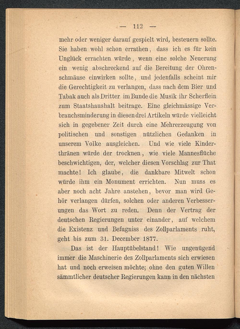 mehr oder weniger darauf gespielt wird, besteuern sollte.Sie haben wohl schon errathen, dass ich es für keinUnglück errachten würde, wenn eine solche Neuerungein wenig abschreckend auf die Bereitung der Ohren-schmäuse einwirken sollte, und jedenfalls scheint mirdie Gerechtigkeit zu verlangen, dass nach dem Bier undTabak auch als Dritter im Bunde die Musik ihr Scherfleinzum Staatshaushalt beitrage. Eine gleichmässige Ver-brauchsminderungin diesen drei Artikeln würde vielleichtsich in gegebener Zeit durch eine Mehrerzeugung vonpolitischen und sonstigen nützlichen Gedanken inunserem Volke ausgleichen. Und wie viele Kinder-thränen würde der trocknen, wie viele Mannesflüchebeschwichtigen, der, welcher diesen Vorschlag zur Thatmachte! Ich glaube, die dankbare Mitwelt schonwürde ihm ein Monument errichten. Nun muss esaber noch acht Jahre anstehen, bevor man wird Ge-hör verlangen dürfen, solchen oder anderen Verbesser-ungen das Wort zu reden. Denn der Vertrag derdeutschen Begierungen unter einander, auf welchemdie Existenz und Befugniss des Zollparlaments ruht,geht bis zum 31. December 1877.