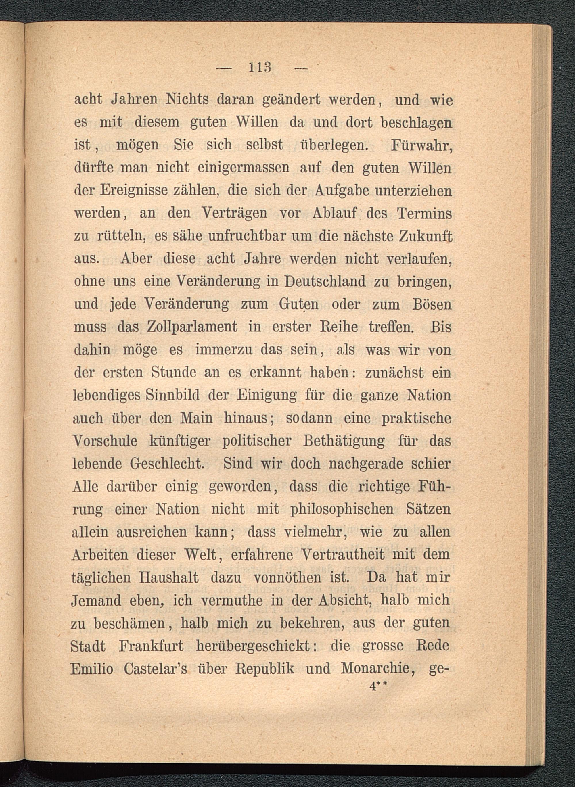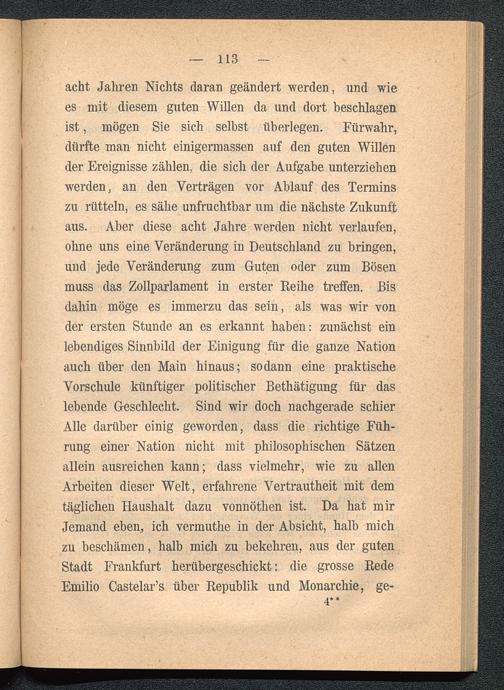 acht Jahren Nichts daran geändert werden, und wiees mit diesem guten Willen da und dort beschlagenist, mögen Sie sich selbst überlegen. Fürwahr,dürfte man nicht einigermassen auf den guten Willender Ereignisse zählen, die sich der Aufgabe unterziehenwerden, an den Verträgen vor Ablauf des Terminszu rütteln, es sähe unfruchtbar um die nächste Zukunftaus. Aber diese acht Jahre werden nicht verlaufen,ohne uns eine Veränderung in Deutschland zu bringen,und jede Veränderung zum Guten oder zum Bösenmuss das Zollparlament in erster Reihe treffen. Bisdahin möge es immerzu das sein, als was wir vonder ersten Stunde an es erkannt haben: zunächst einlebendiges Sinnbild der Einigung für die ganze Nationauch über den Main hinaus; sodann eine praktischeVorschule künftiger politischer Bethätigung für daslebende Geschlecht. Sind wir doch nachgerade schierAlle darüber einig geworden, dass die richtige Füh-rung einer Nation nicht mit philosophischen Sätzenallein ausreichen kann; dass vielmehr, wie zu allenArbeiten dieser Welt, erfahrene Vertrautheit mit demtäglichen Haushalt dazu vonnöthen ist. Da hat mirJemand eben, ich vermuthe in der Absicht, halb michzu beschämen, halb mich zu bekehren, aus der gutenStadt Frankfurt herübergeschickt: die grosse Rede