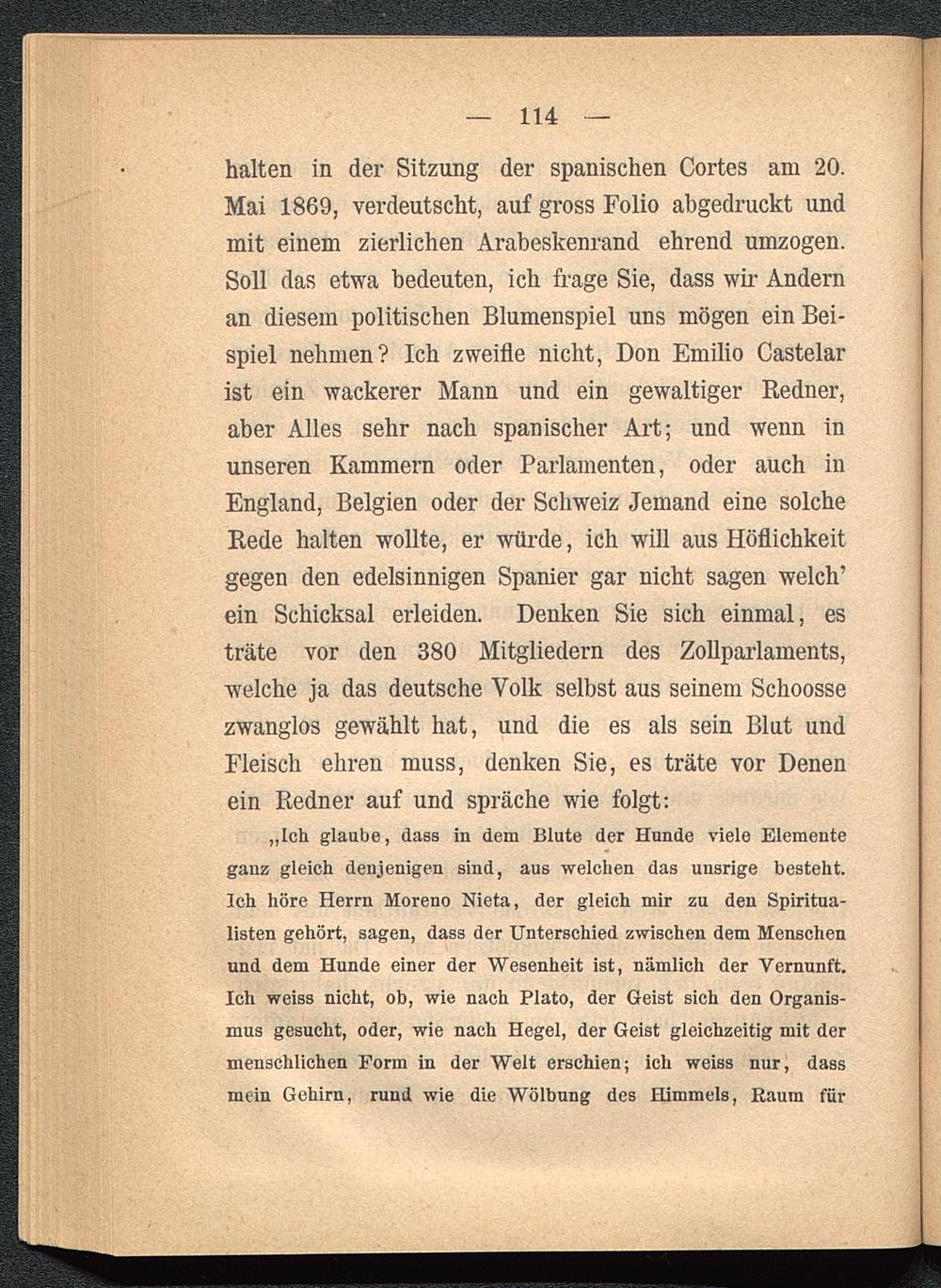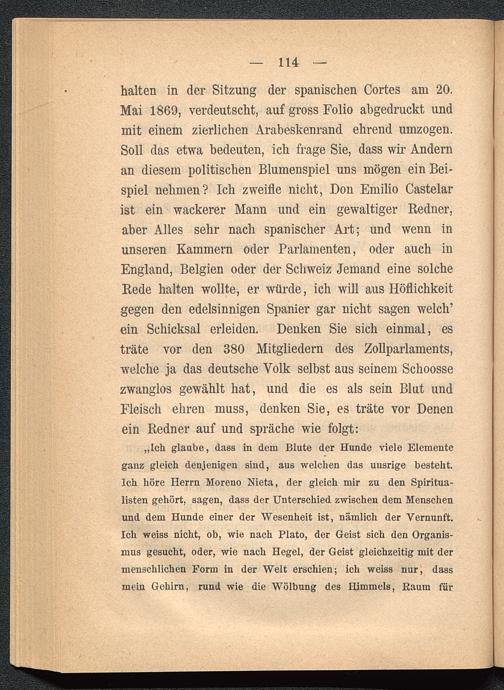 halten in der Sitzung der spanischen Cortes am 20.Mai 1869, verdeutscht, auf gross Folio abgedruckt undmit einem zierlichen Arabeskenrand ehrend umzogen.Soll das etwa bedeuten, ich frage Sie, dass wir Andernan diesem politischen Blumenspiel uns mögen ein Bei-spiel nehmen? Ich zweifle nicht, Don Emilio Castelar ist ein wackerer Mann und ein gewaltiger Redner,aber Alles sehr nach spanischer Art; und wenn inunseren Kammern oder Parlamenten, oder auch inEngland, Belgien oder der Schweiz Jemand eine solcheRede halten wollte, er würde, ich will aus Höflichkeitgegen den edelsinnigen Spanier gar nicht sagen welch’ein Schicksal erleiden. Denken Sie sich einmal, esträte vor den 380 Mitgliedern des Zollparlaments,welche ja das deutsche Volk selbst aus seinem Schoossezwanglos gewählt hat, und die es als sein Blut undFleisch ehren muss, denken Sie, es träte vor Denenein Redner auf und spräche wie folgt: