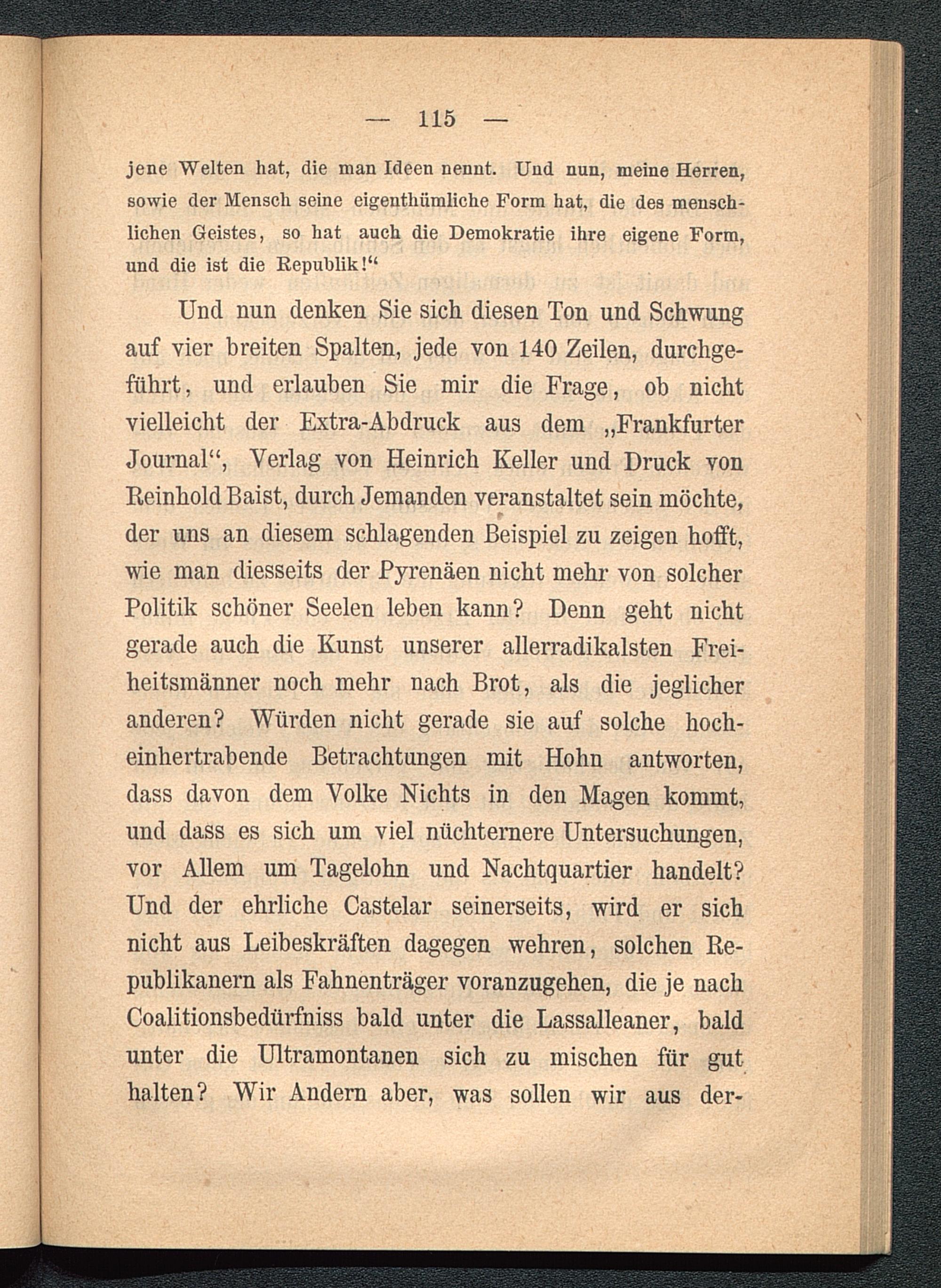 Und nun denken Sie sich diesen Ton und Schwungauf vier breiten Spalten, jede von 140 Zeilen, durchge-führt, und erlauben Sie mir die Frage, ob nichtvielleicht der Extra-Abdruck aus dem „FrankfurterJournal“, Verlag von Heinrich Keller und Druck vonReinhold Baist, durch Jemanden veranstaltet sein möchte,der uns an diesem schlagenden Beispiel zu zeigen hofft,wie man diesseits der Pyrenäen nicht mehr von solcherPolitik schöner Seelen leben kann? Denn geht nichtgerade auch die Kunst unserer allerradikalsten Frei-heitsmänner noch mehr nach Brot, als die jeglicheranderen? Würden nicht gerade sie auf solche hoch-einhertrabende Betrachtungen mit Hohn antworten,dass davon dem Volke Nichts in den Magen kommt,und dass es sich um viel nüchternere Untersuchungen,vor Allem um Tagelohn und Nachtquartier handelt?Und der ehrliche Castelar seinerseits, wird er sichnicht aus Leibeskräften dagegen wehren, solchen Re-publikanern als Fahnenträger voranzugehen, die je nachCoalitionsbedürfniss bald unter die Lassalleaner, baldunter die Ultramontanen sich zu mischen für guthalten? Wir Andern aber, was sollen wir aus der-