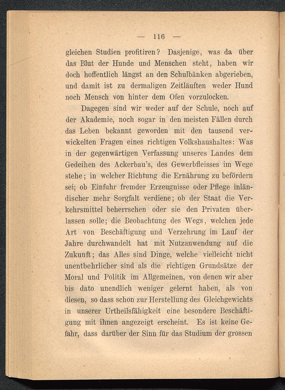 Dagegen sind wir weder auf der Schule, noch aufder Akademie, noch sogar in den meisten Fällen durchdas Leben bekannt geworden mit den tausend ver-wickelten Fragen eines richtigen Volkshaushaltes: Wasin der gegenwärtigen Verfassung unseres Landes demGedeihen des Ackerbau’s, des Gewerbfleisses im Wegestehe; in welcher Richtung die Ernährung zu befördernsei; ob Einfuhr fremder Erzeugnisse oder Pflege inlän-discher mehr Sorgfalt verdiene; ob der Staat die Ver-kehrsmittel beherrschen oder sie den Privaten über-lassen solle; die Beobachtung des Wegs, welchen jedeArt von Beschäftigung und Verzehrung im Lauf derJahre durchwandelt hat mit Nutzanwendung auf dieZukunft; das Alles sind Dinge, welche vielleicht nichtunentbehrlicher sind als die richtigen Grundsätze derMoral und Politik im Allgemeinen, von denen wir aberbis dato unendlich weniger gelernt haben, als vondiesen, so dass schon zur Herstellung des Gleichgewichtsin unserer Urtheilsfähigkeit eine besondere Beschäfti-gung mit ihnen angezeigt erscheint. Es ist keine Ge-fahr, dass darüber der Sinn für das Studium der grossen