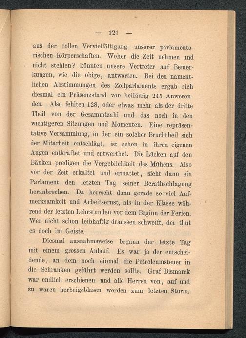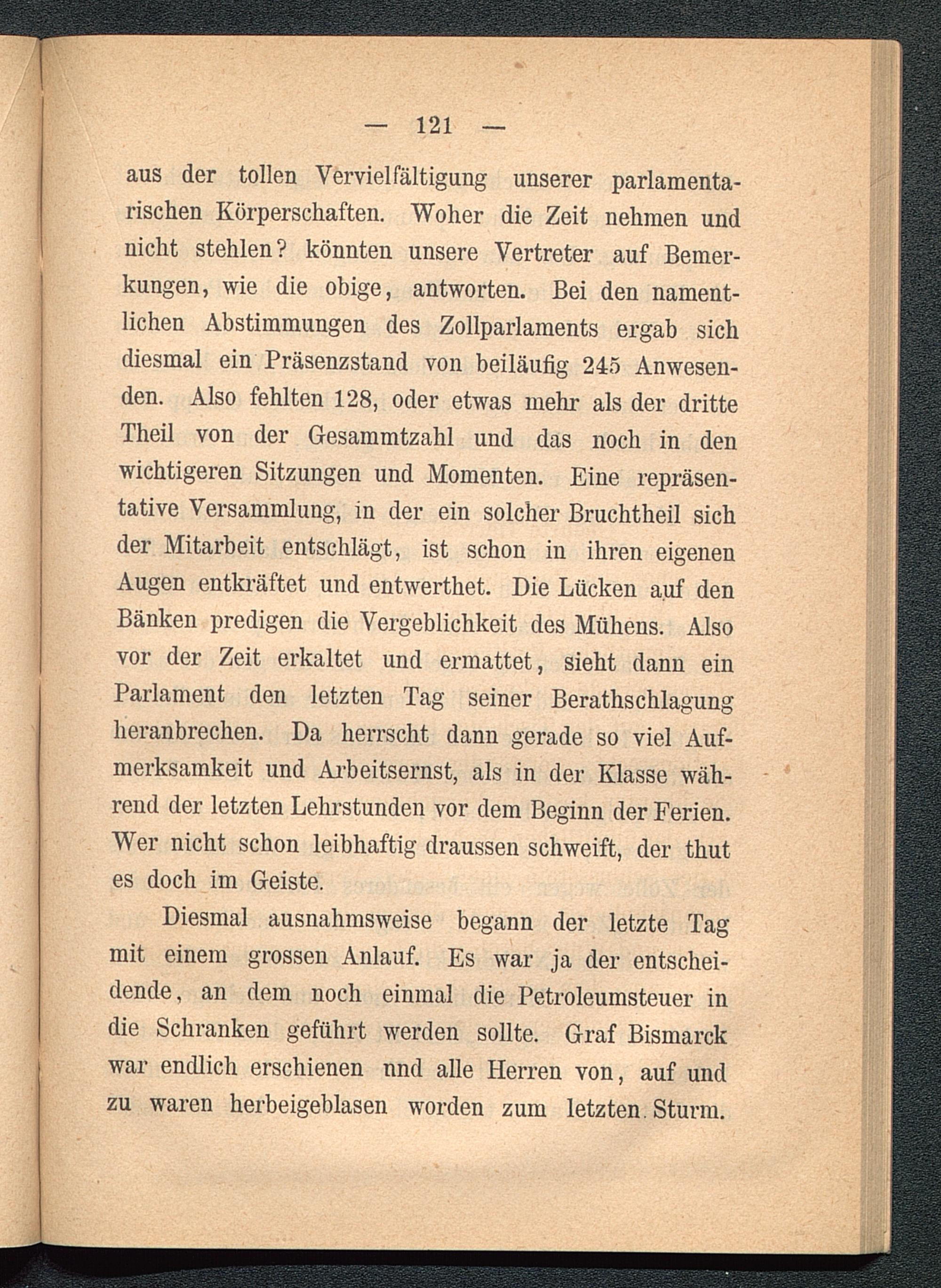 Diesmal ausnahmsweise begann der letzte Tagmit einem grossen Anlauf. Es war ja der entschei-dende, an dem noch einmal die Petroleumsteuer indie Schranken geführt werden sollte. Graf Bismarckwar endlich erschienen nnd alle Herren von, auf undzu waren herbeigeblasen worden zum letzten. Sturm.