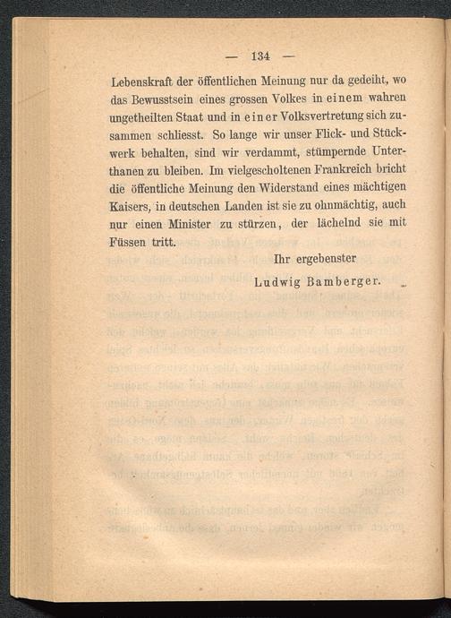 Lebenskraft der öffentlichen Meinung nur da gedeiht, wodas Bewusstsein eines grossen Volkes in einem wahrenungeteilten Staat und in ein er Volksvertretung sich zu-sammen schliesst. So lange wir unser Flick- und Stück-werk behalten, sind wir verdammt, stümpernde Unter-tanen zu bleiben. Ln vielgescholtenen Frankreich brichtdie öffentliche Meinung den Widerstand eines mächtigenKaisers, in deutschen Landen ist sie zu ohnmächtig, auchnur einen Minister zu stürzen, der lächelnd sie mitFüssen tritt.