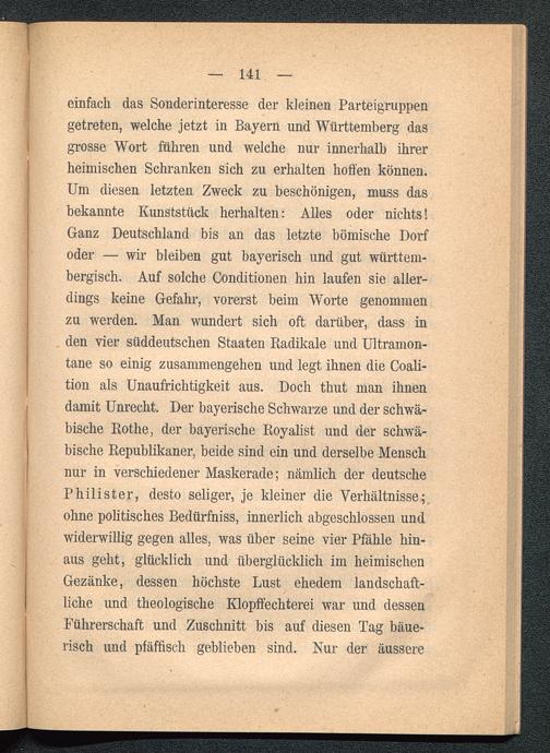 einfach das Sonderinteresse der kleinen Parteigruppengetreten, welche jetzt in Bayern und Württemberg dasgrosse Wort führen und welche nur innerhalb ihrerheimischen Schranken sich zu erhalten hohen können.Um diesen letzten Zweck zu beschönigen, muss dasbekannte Kunststück herhalten: Alles oder nichts!Ganz Deutschland bis an das letzte bömische Dorfoder — wir bleiben gut bayerisch und gut württein-bergisch. Auf solche Conditionen hin laufen sie aller-dings keine Gefahr, vorerst beim Worte genommenzu werden. Man wundert sich oft darüber, dass inden vier süddeutschen Staaten Radikale und Ultramon-tane so einig Zusammengehen und legt ihnen die Coali-tion als Unaufrichtigkeit aus. Doch thut man ihnendamit Unrecht. Der bayerische Schwarze und der schwä-bische Rothe, der bayerische Royalist und der schwä-bische Republikaner, beide sind ein und derselbe Menschnur in verschiedener Maskerade; nämlich der deutsche Philister, desto seliger, je kleiner die Verhältnisse;ohne politisches Bedürfniss, innerlich abgeschlossen undwiderwillig gegen alles, was über seine vier Pfähle hin-aus geht, glücklich und überglücklich im heimischenGezanke, dessen höchste Lust ehedem landschaft-liche und theologische Klopffechterei war und dessenFührerschaft und Zuschnitt bis auf diesen Tag bäue-risch und pfäffisch geblieben sind. Nur der äussere