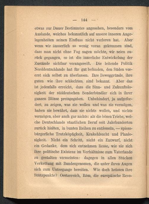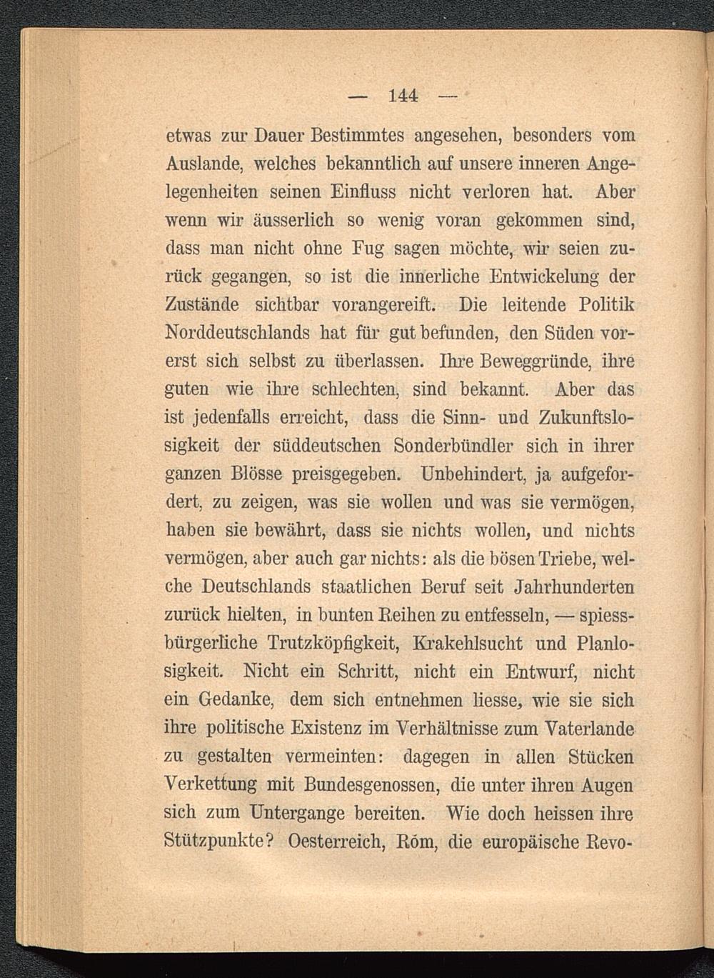 etwas zur Dauer Bestimmtes angesehen, besonders vomAuslande, welches bekanntlich auf unsere inneren Ange-legenheiten seinen Einfluss nicht verloren hat. Aberwenn wir äusserlich so wenig voran gekommen sind,dass man nicht ohne Fug sagen möchte, wir seien zu-rück gegangen, so ist die innerliche Entwickelung derZustände sichtbar vorangereift. Die leitende PolitikNorddeutschlands hat für gut befunden, den Süden vor-erst sich selbst zu überlassen. Ihre Beweggründe, ihreguten wie ihre schlechten, sind bekannt. Aber dasist jedenfalls erreicht, dass die Sinn- und Zukunftslo-sigkeit der süddeutschen Sonderbündler sich in ihrerganzen Blosse preisgegeben. Unbehindert, ja aufgefor-dert, zu zeigen, was sie wollen und was sie vermögen,haben sie bewährt, dass sie nichts wollen, und nichtsvermögen, aber auch gar nichts: als die bösen Triebe, wel-che Deutschlands staatlichen Beruf seit Jahrhundertenzurück hielten, in bunten Reihen zu entfesseln, — spiess-bürgerliche Trutzköpfigkeit, Krakehlsucht und Planlo-sigkeit. Nicht ein Schritt, nicht ein Entwurf, nichtein Gedanke, dem sich entnehmen Hesse, wie sie sichihre politische Existenz im Verhältnisse zum Vaterlandezu gestalten vermeinten: dagegen in allen StückenVerkettung mit Bundesgenossen, die unter ihren Augensich zum Untergange bereiten. Wie doch heissen ihreStützpunkte? Oesterreich, Rom, die europäische Revo-