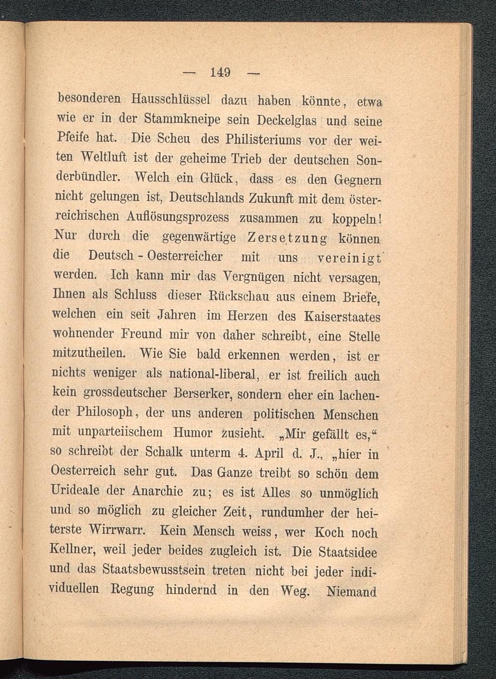 besonderen Hausschlüssel dazu haben könnte, etwawie er in der Stammkneipe sein Deckelglas und seinePfeife hat. Die Scheu des Philisteriums vor der wei-ten Weltluft ist der geheime Trieb der deutschen Son-derbündler. Welch ein Glück, dass es den Gegnernnicht gelungen ist, Deutschlands Zukunft mit dem öster-reichischen Auflösungsprozess zusammen zu koppeln!Nur durch die gegenwärtige Zersetzung könnendie Deutsch - Oesterreicher mit uns vereinigtwerden. Ich kann mir das Vergnügen nicht versagen,Ihnen als Schluss dieser Rückschau aus einem Briefe,welchen ein seit Jahren im Herzen des Kaiserstaateswohnender Freund mir von daher schreibt, eine Stellemitzutheilen. Wie Sie bald erkennen werden, ist ernichts weniger als national-liberal, er ist freilich auchkein grossdeutsclier Berserker, sondern eher ein lachen-der Philosoph, der uns anderen politischen Menschenmit unparteiischem Humor zusieht. „Mir gefällt es,“so schreibt der Schalk unterm 4. Api’il d. J., „hier inOesterreich sehr gut. Das Ganze treibt so schön demUrideale der Anarchie zu; es ist Alles so unmöglichund so möglich zu gleicher Zeit, rundumher der hei-terste Wirrwarr. Kein Mensch weiss, wer Koch nochKellner, weil jeder beides zugleich ist. Die Staatsideeund das Staatsbewusstsein treten nicht bei jeder indi-viduellen Regung hindernd in den Weg. Niemand