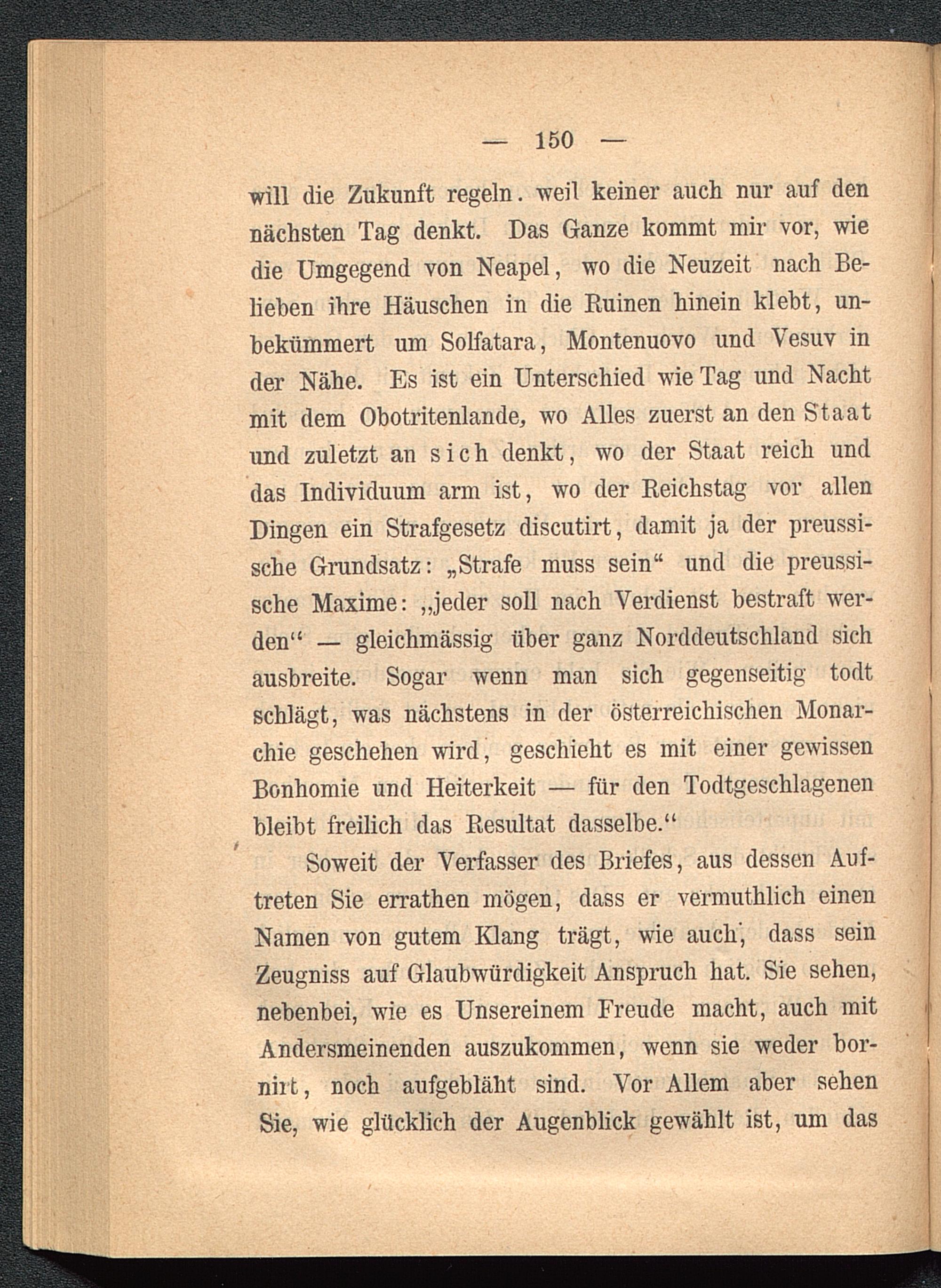will die Zukunft regeln, weil keiner auch nur auf dennächsten Tag denkt. Das Ganze kommt mir vor, wiedie Umgegend von Neapel , wo die Neuzeit nach Be-lieben ihre Häuschen in die Ruinen hinein klebt, un-bekümmert um Solfatara, Montenuovo und Vesuv inder Nähe. Es ist ein Unterschied wie Tag und Nachtmit dem Obotritenlande, wo Alles zuerst an den Staatund zuletzt an sich denkt, wo der Staat reich unddas Individuum arm ist, wo der Reichstag vor allenDingen ein Strafgesetz discutirt, damit ja der preussi-sche Grundsatz: „Strafe muss sein“ und die preussi-sche Maxime: „jeder soll nach Verdienst bestraft wer-den“ — gleichmässig über ganz Norddeutschland sichausbreite. Sogar wenn man sich gegenseitig todtschlägt, was nächstens in der österreichischen Monar-chie geschehen wird, geschieht es mit einer gewissenBonhomie und Heiterkeit — für den Todtgeschlagenenbleibt freilich das Resultat dasselbe.“